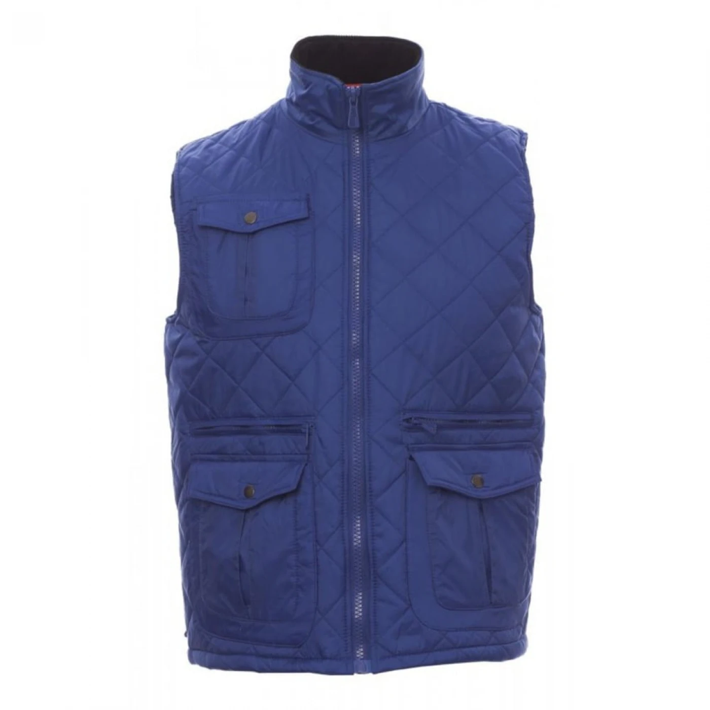 Vestă pentru bărbați cu captuseala interioara matlasata. Materialul este impermeabil, rezistent la vânt, densitatea si textura tesaturii nu permit trecerea aerului si asigura o izolatie termica suficienta. Închiderea se face cu un fermoar de 8 mm din plastic cu cursor metalic. Este echipata cu fante laterale prevazute cu capse metalice pentru mai multa lejeritate, cinci buzunare exterioare, dintre care două cu inchidere cu fermoar din plastic si un buzunar interior. Gulerul interior este dintr-un material velur. \n