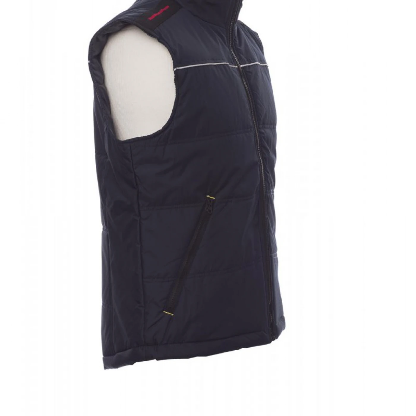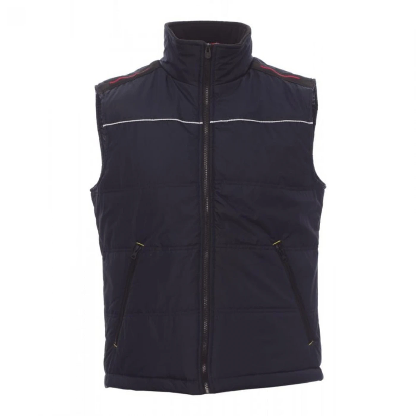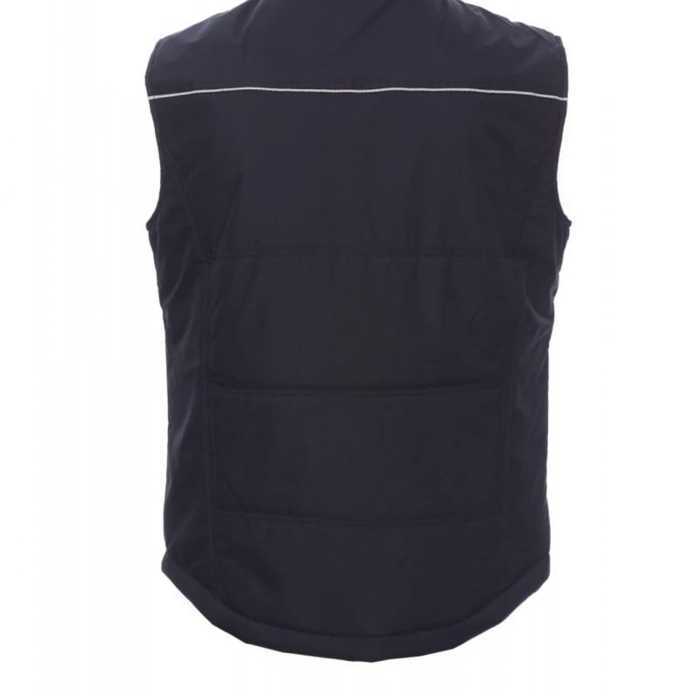 Vesta de lucru unisex confectionata din 100% polyester pongee. Inchidere frontala cu fermoar din plastic, spate conturat, echipata cu doua buzunare exterioare spatioase cu fermoar si cusatura reflectorizanta pe fata si spate. Are căptușeală de înaltă densitate, guler interior din lână si un buzunar interior.