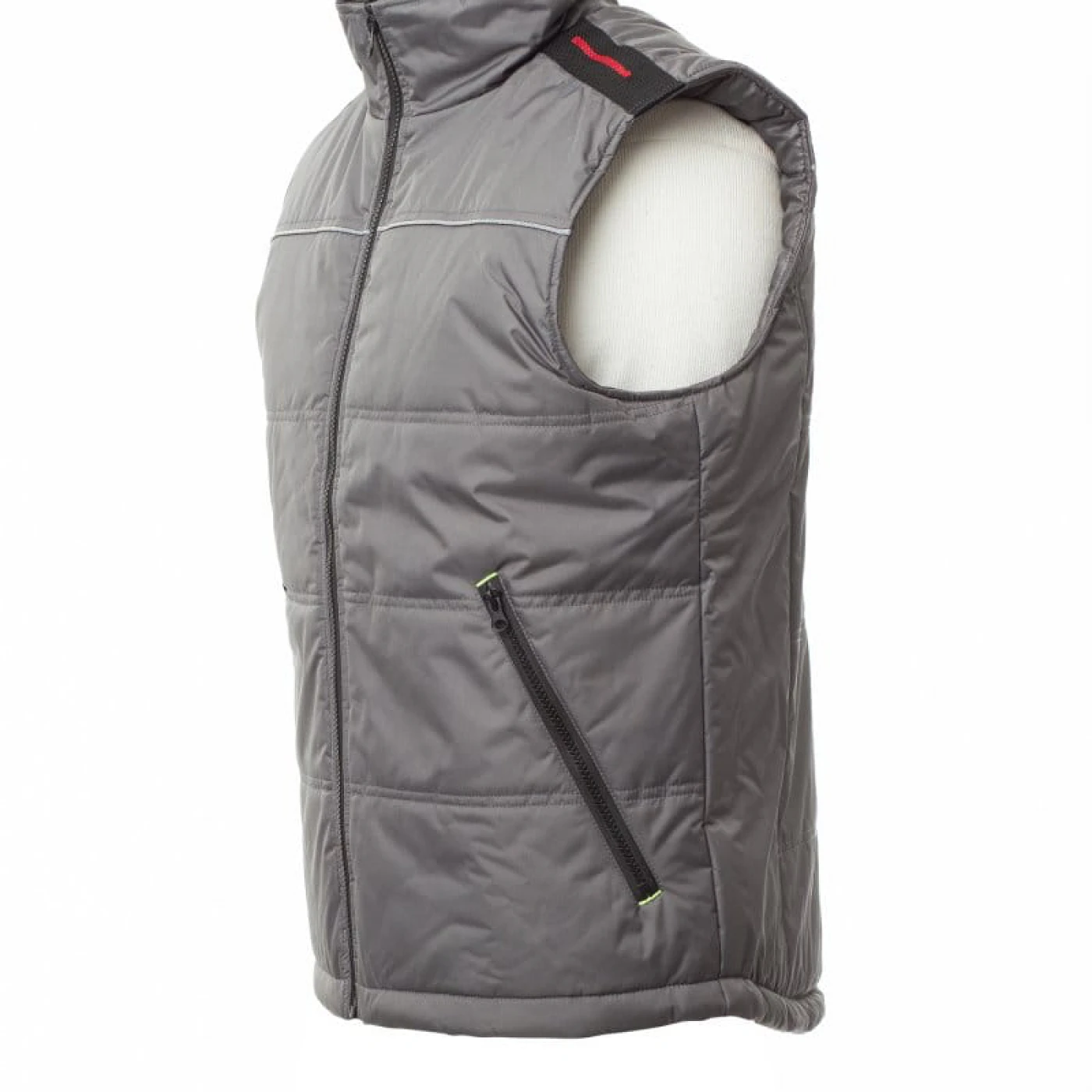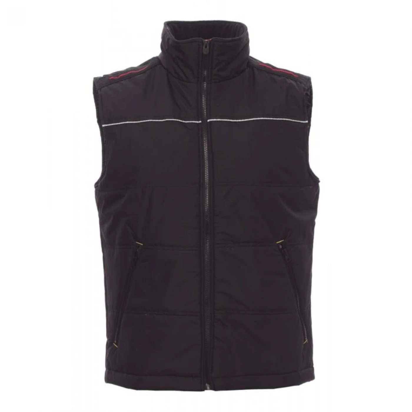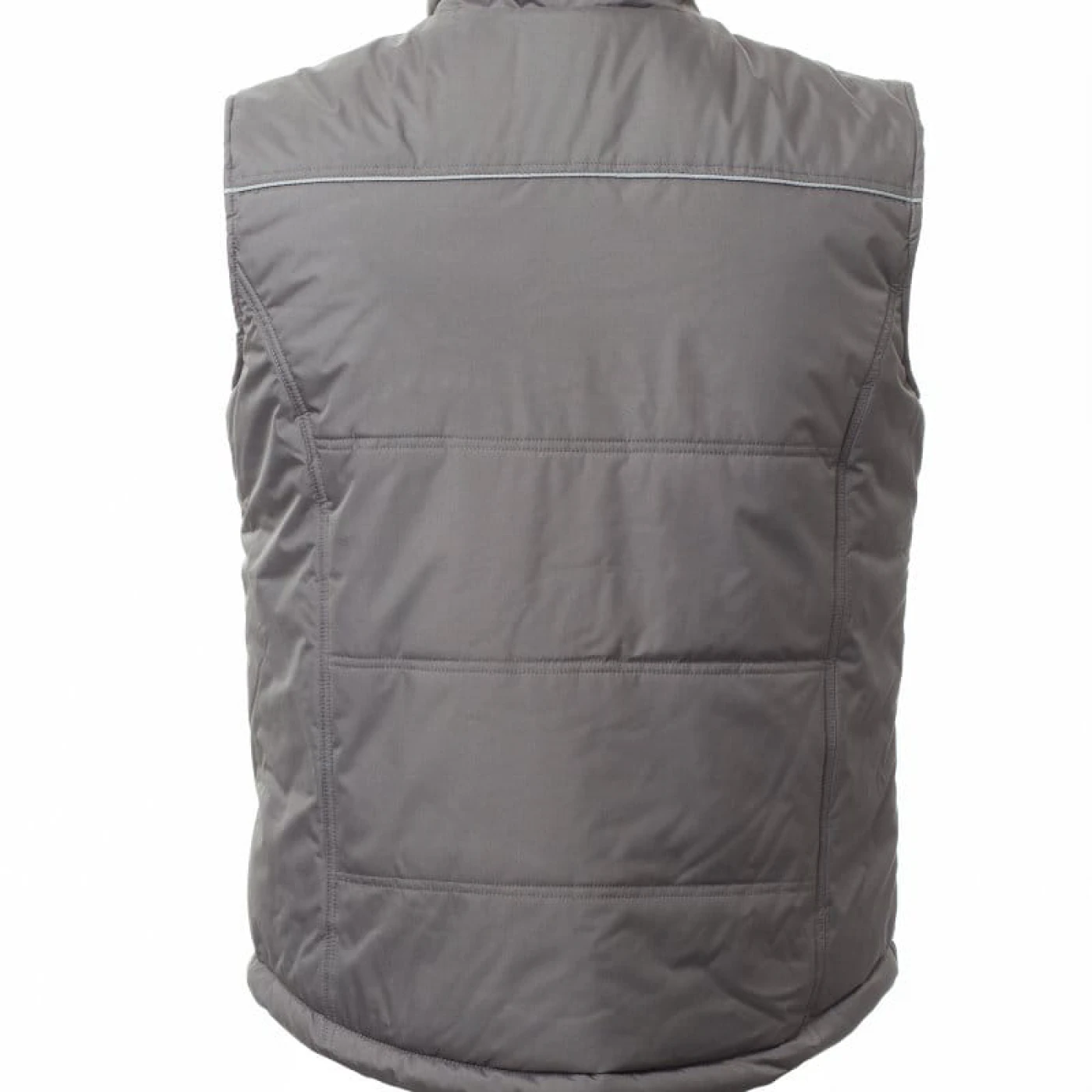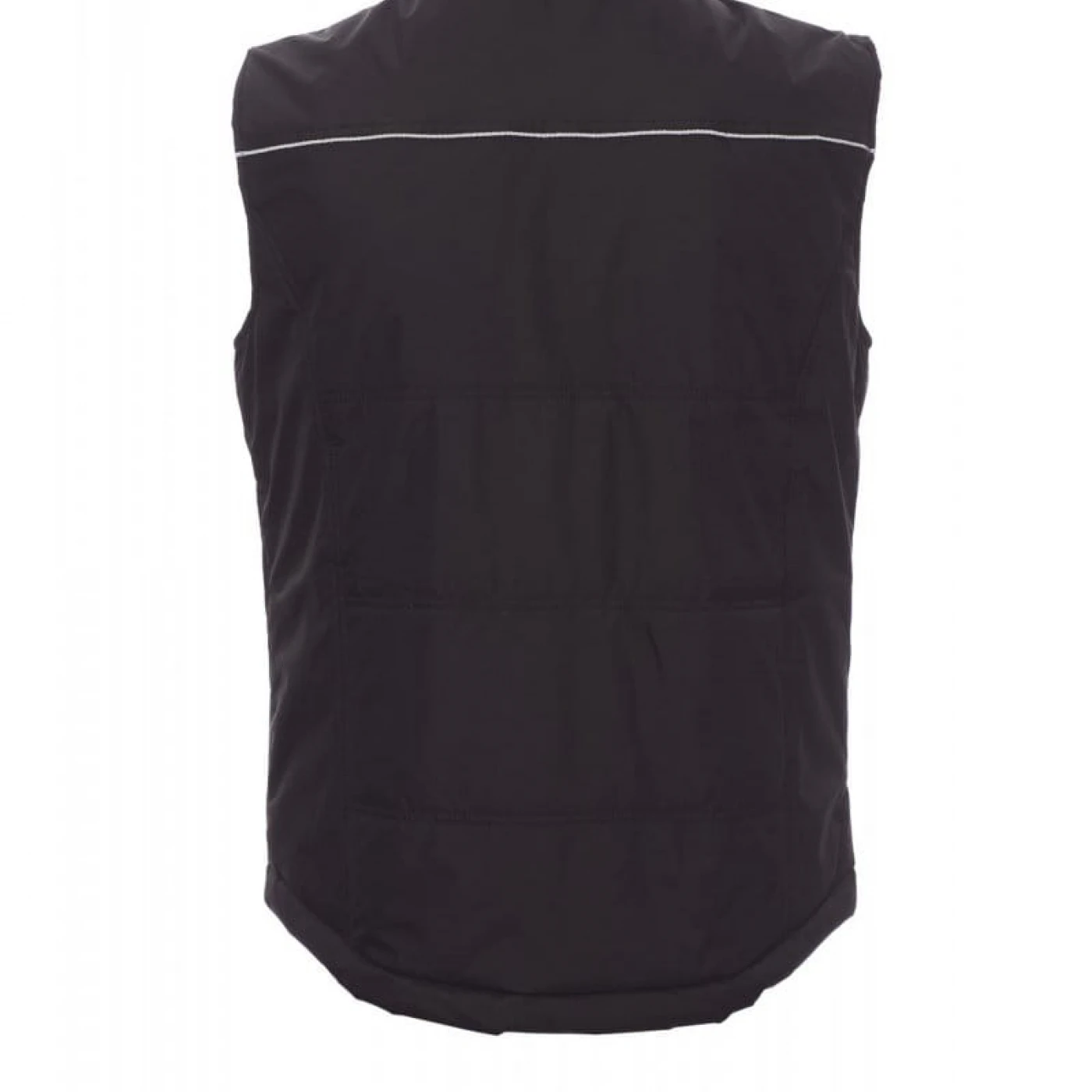 Vesta de lucru unisex confectionata din 100% polyester pongee. Inchidere frontala cu fermoar din plastic, spate conturat, echipata cu doua buzunare exterioare spatioase cu fermoar si cusatura reflectorizanta pe fata si spate. Are căptușeală de înaltă densitate, guler interior din lână si un buzunar interior.