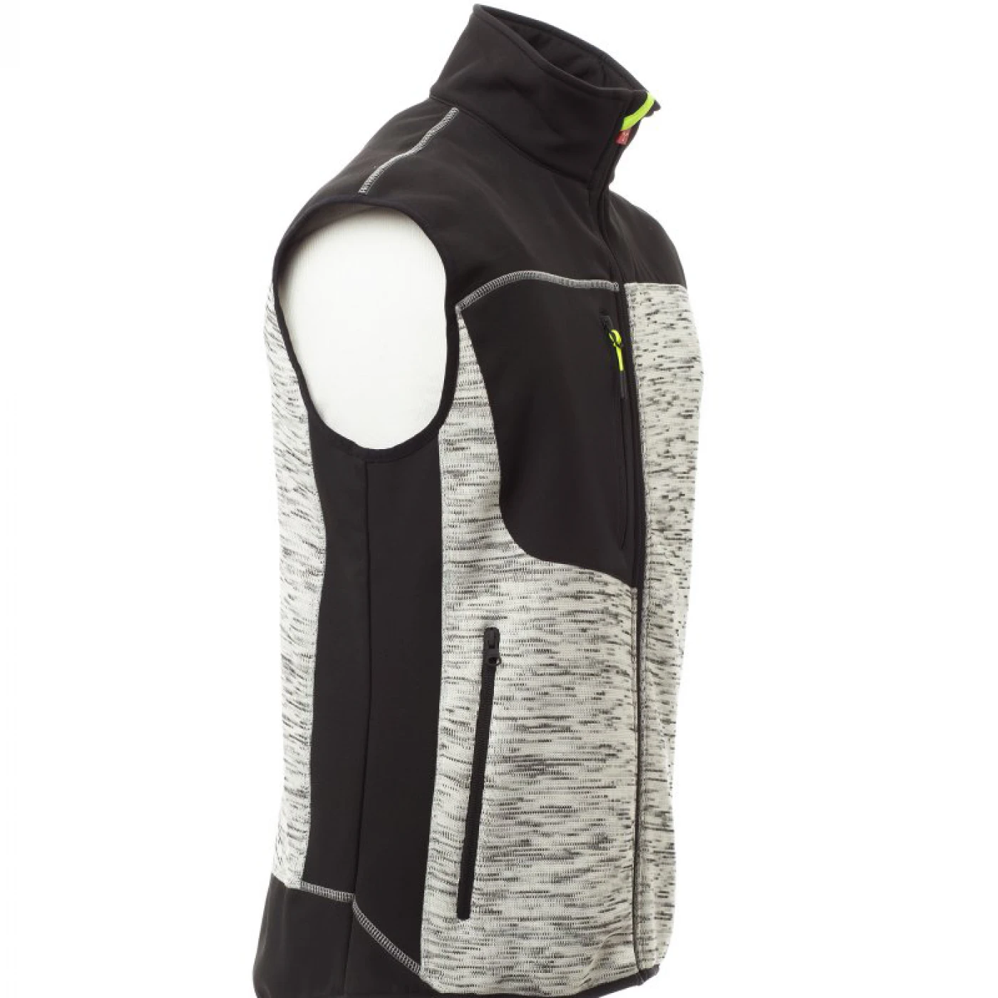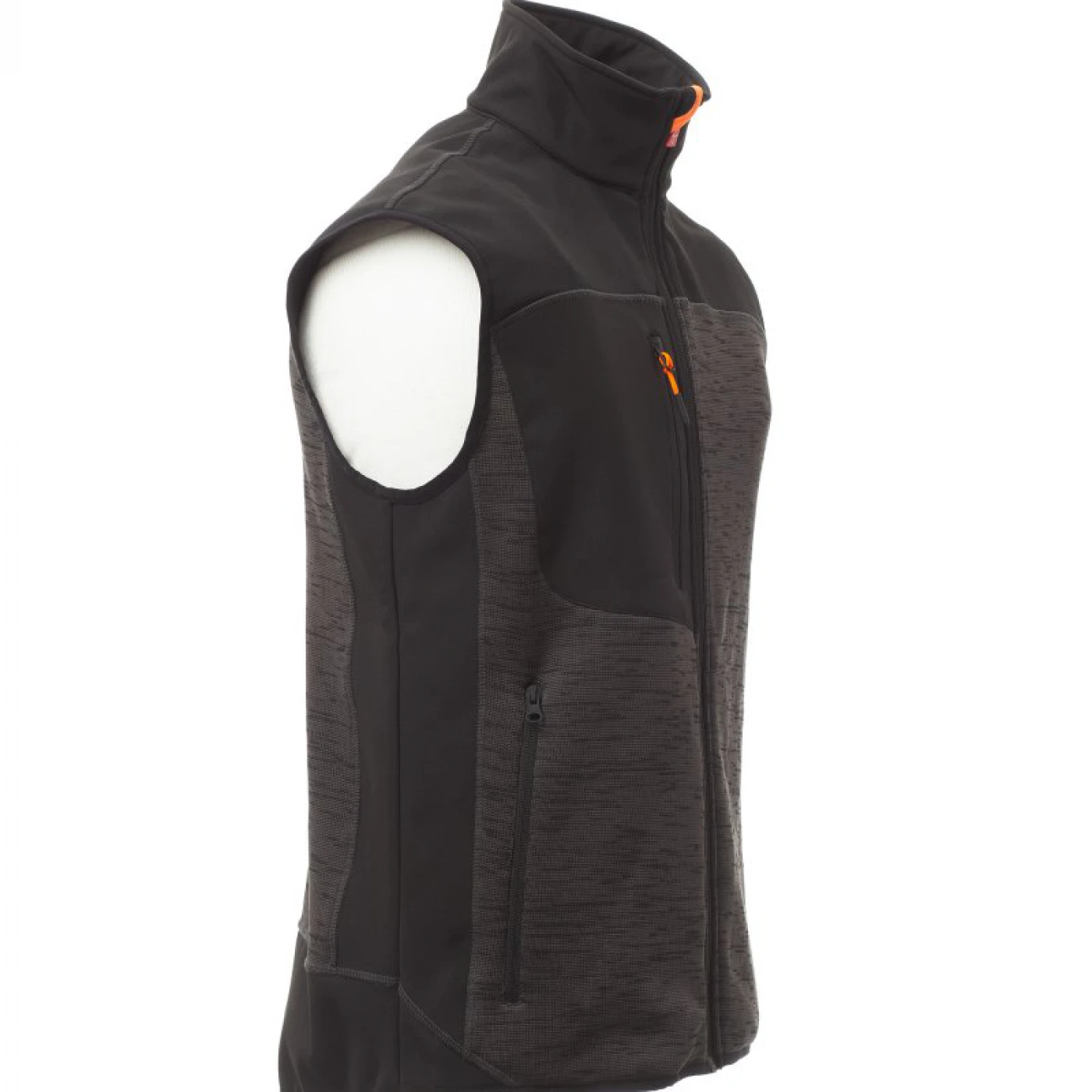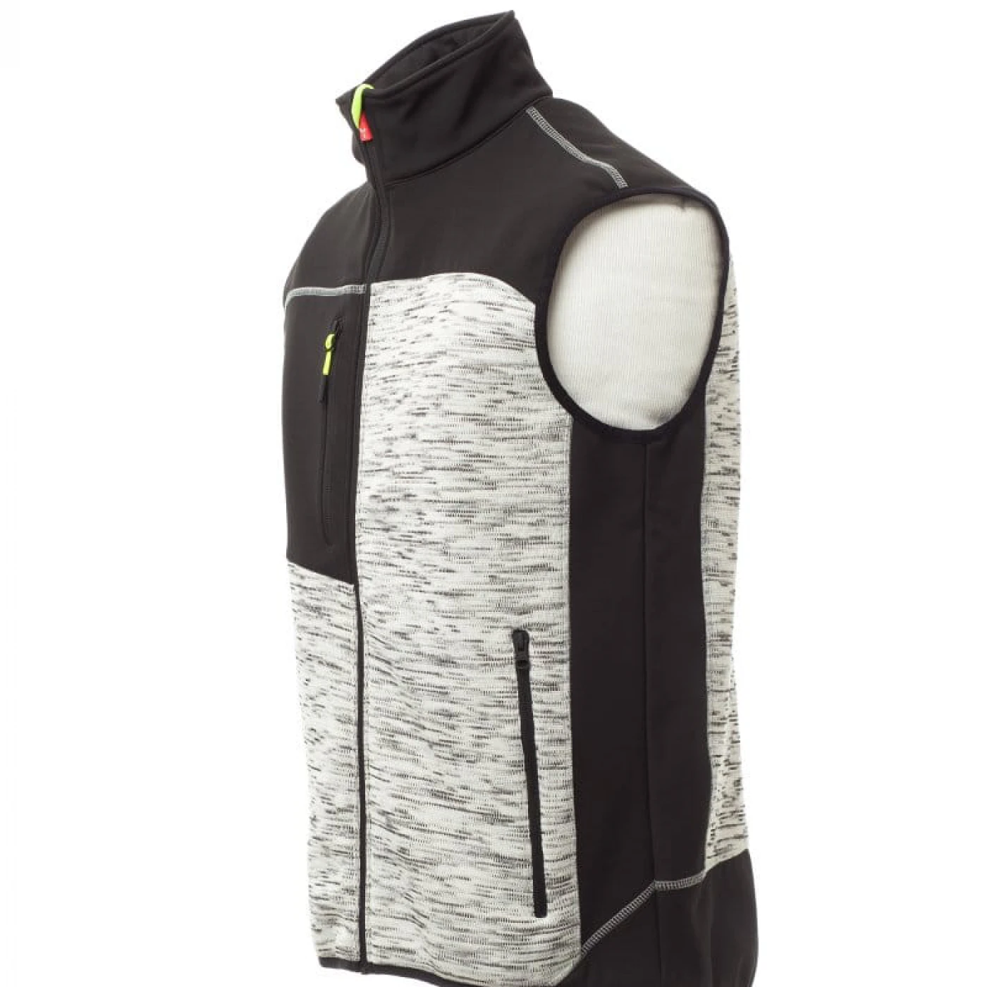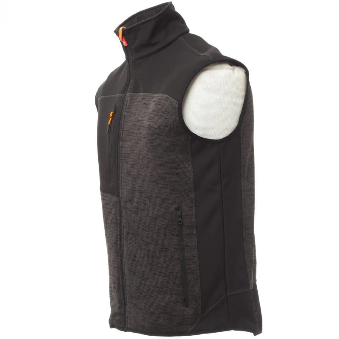 Vesta confortabila pentru barbati in doua tonuri de culori, confectionata din poliester tricotat si insertii de softshell de culoare neagra. Inchiderea frontala se face cu ajutorul unui fermoar cu glisor metalic si sistem de semiblocare. Echipata cu doua buzunare frontale si unul la piept, toate cu inchidere cu fermoar.