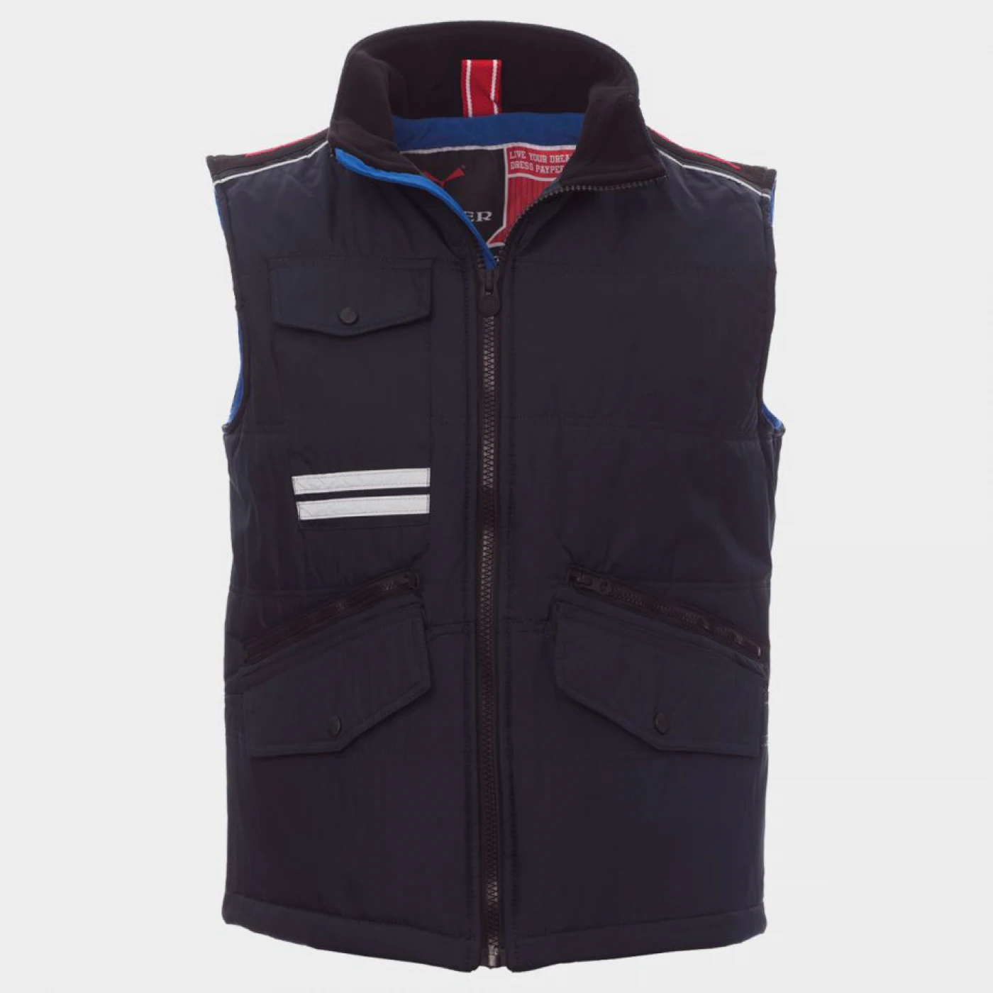 Vestă unisex, fermoar de 8 mm din plastic cu cursor metalic cu clapă și nasturi din plastic, spate profilat, două buzunare exterioare LOCK SYSTEM și două cu fermoare, înclinare a buzunarelor pentru a facilita introducerea mâinilor, un buzunar pe piept pentru smartphone și un inel suport pentru ecuson, benzi reflectorizante pe buzunar și în spate. La interior: vătuită, fleece contrastant pe spate și guler, un buzunar, fermoar interior pentru a facilita imprimarea serigrafică și aplicarea de broderie.