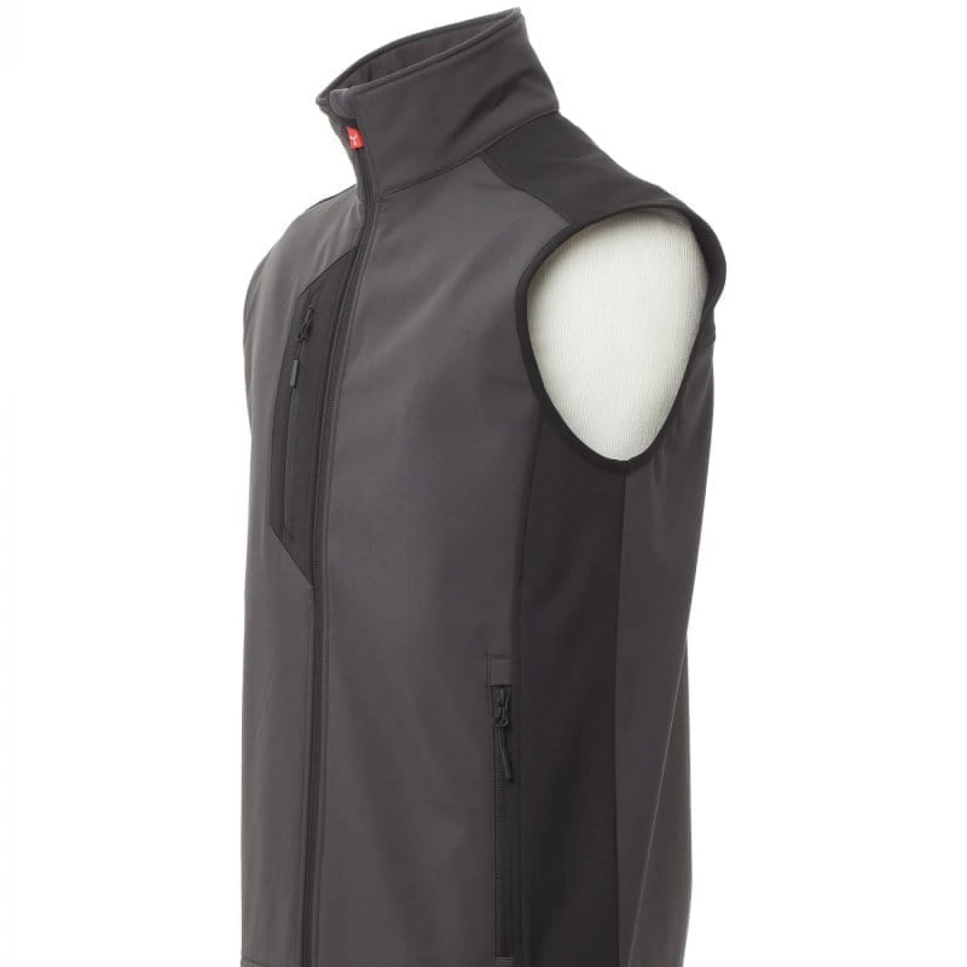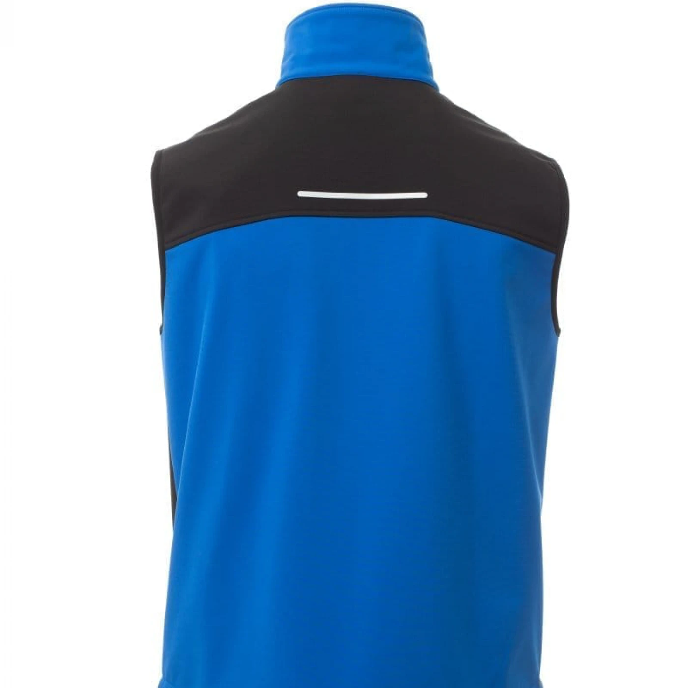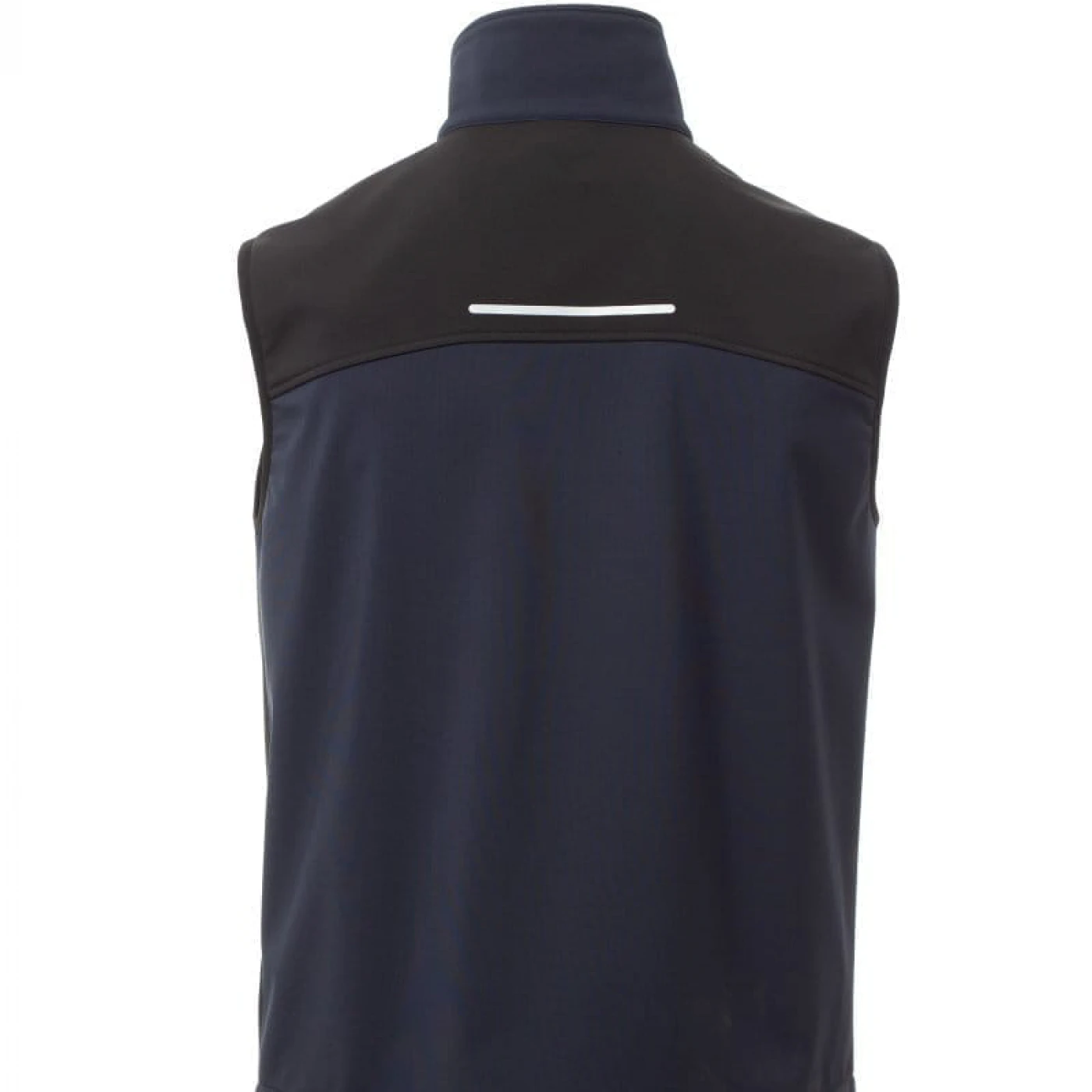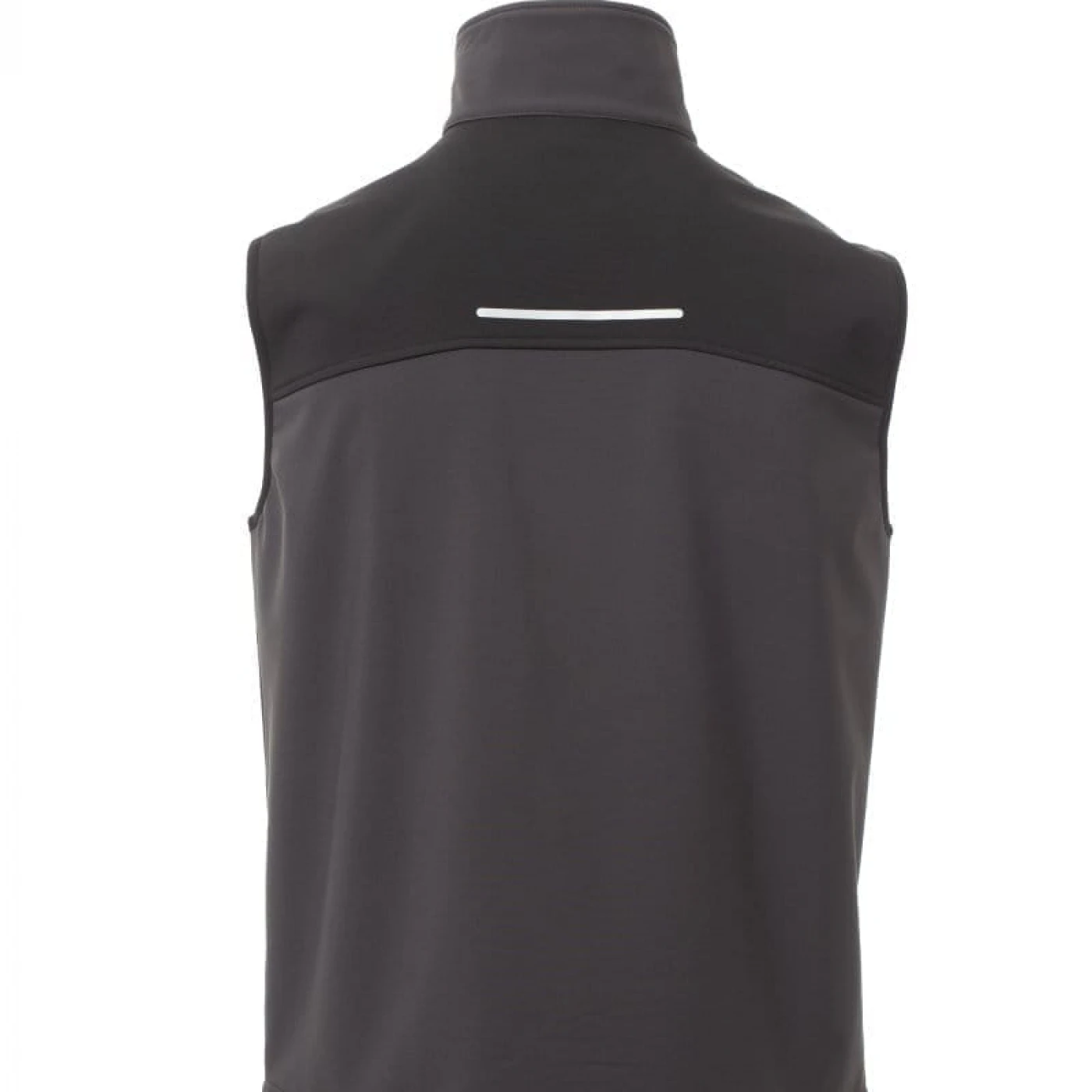 Vestă bărbați soft-shell in doua tonuri de culoare care asigura o protectie sporita impotriva vantului (windproof) si impotriva apei (waterproof - WP 8000 mm H₂O, WVT 5000 g/m² 24h). Inchidere cu fermoar lung cu glisor metalic „semi-auto lock”. Echipata cu două buzunare laterale cu fermoar si un buzunar la piept cu fermoar acoperit. Banda reflectorizanta pe partea din spate.
