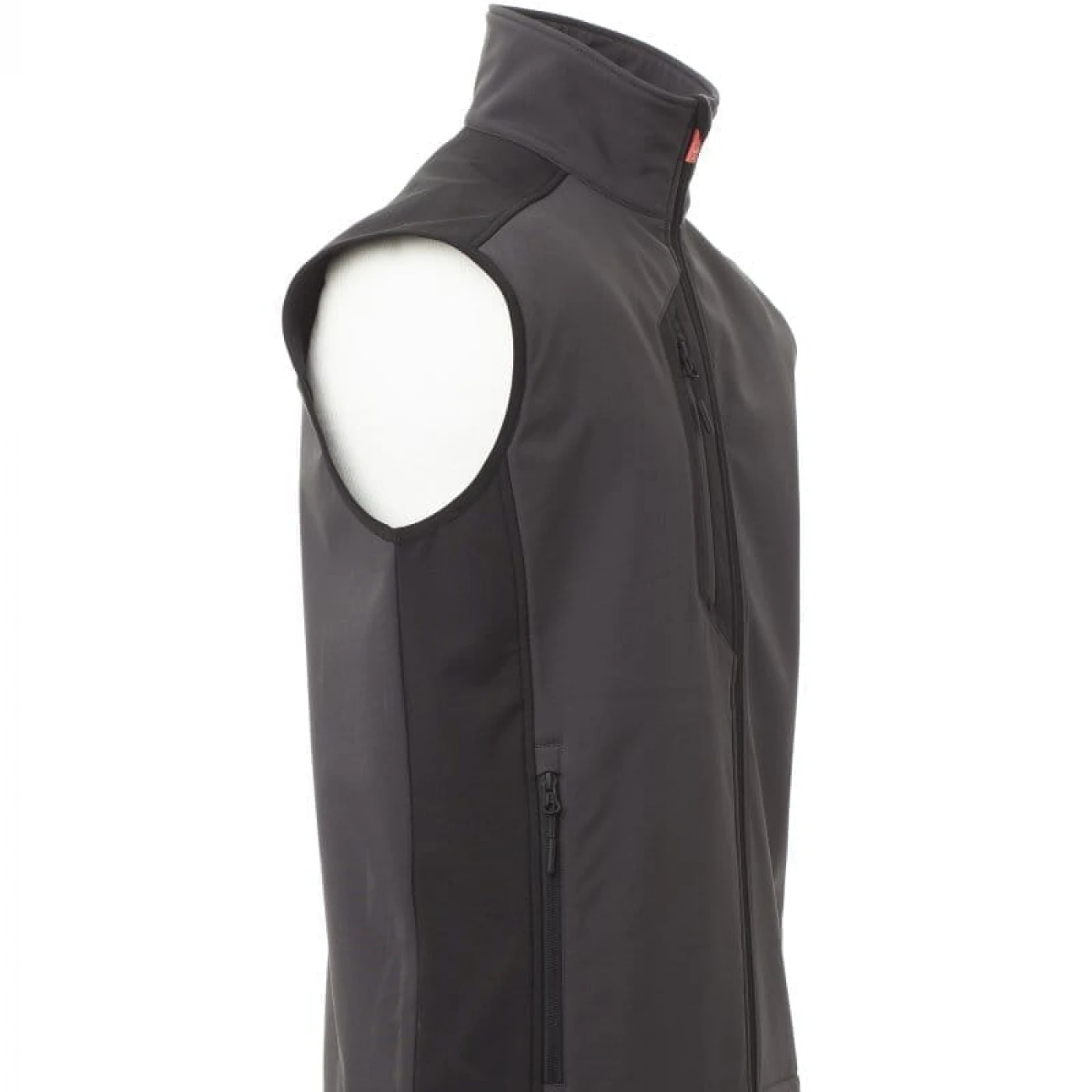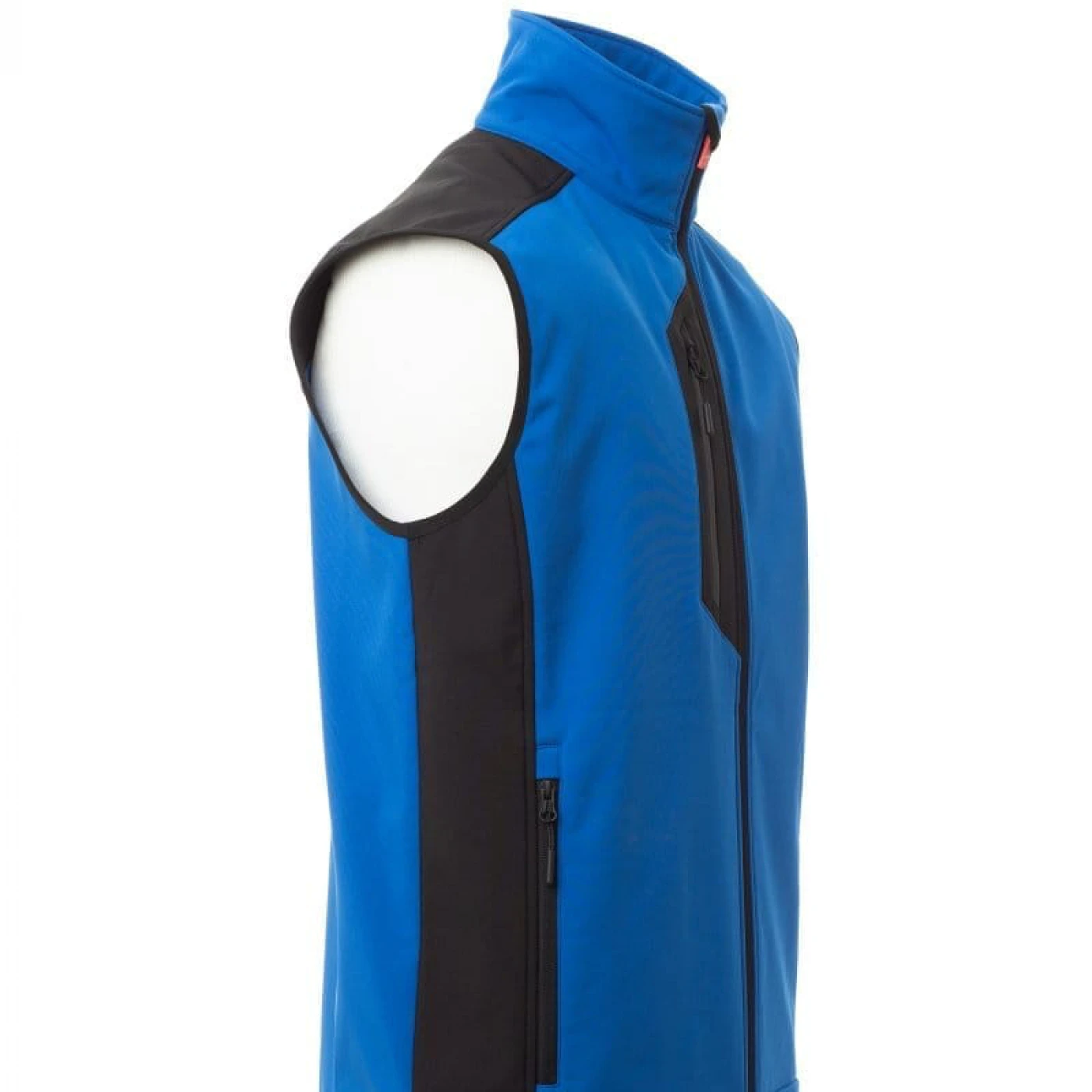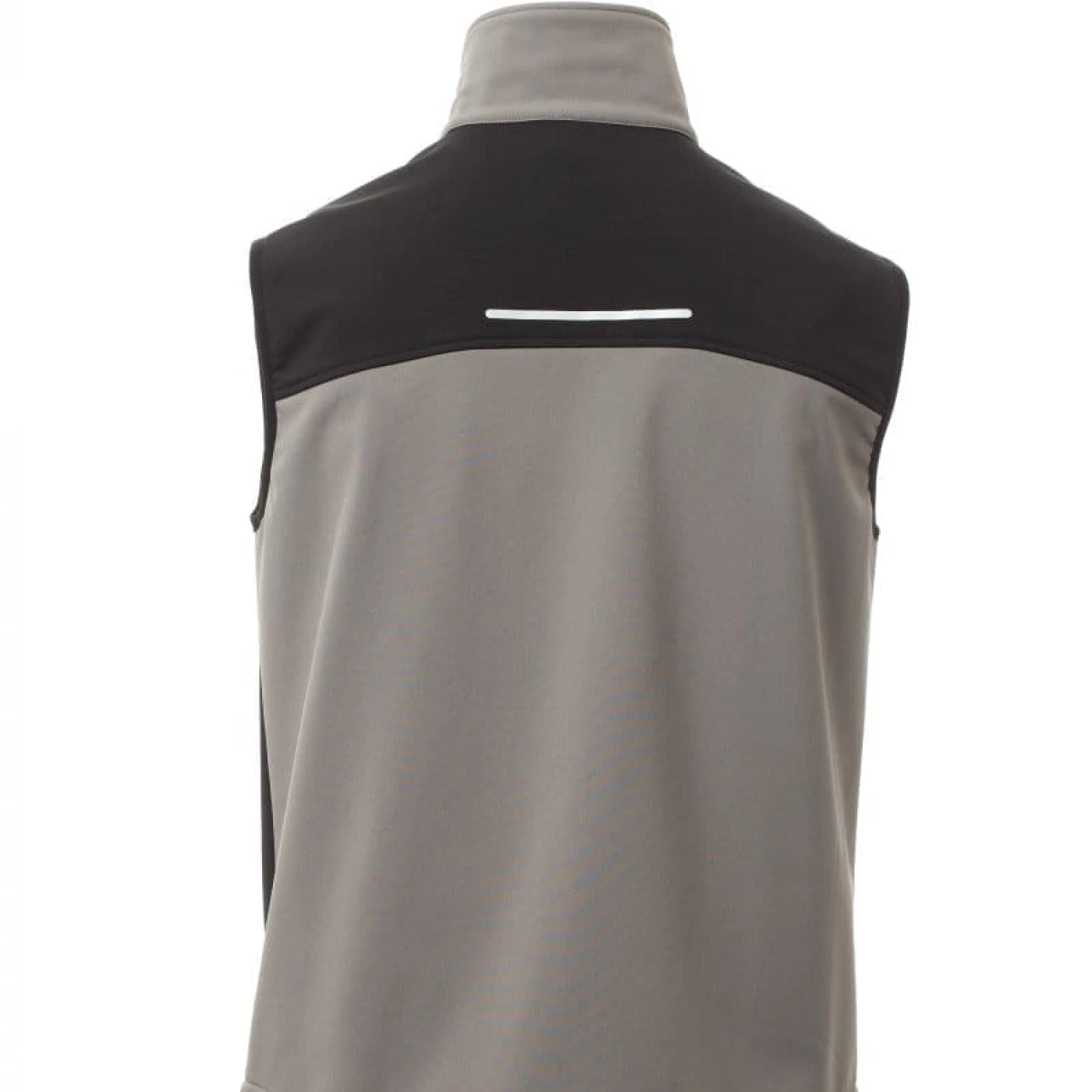 Vestă bărbați soft-shell in doua tonuri de culoare care asigura o protectie sporita impotriva vantului (windproof) si impotriva apei (waterproof - WP 8000 mm H₂O, WVT 5000 g/m² 24h). Inchidere cu fermoar lung cu glisor metalic „semi-auto lock”. Echipata cu două buzunare laterale cu fermoar si un buzunar la piept cu fermoar acoperit. Banda reflectorizanta pe partea din spate.