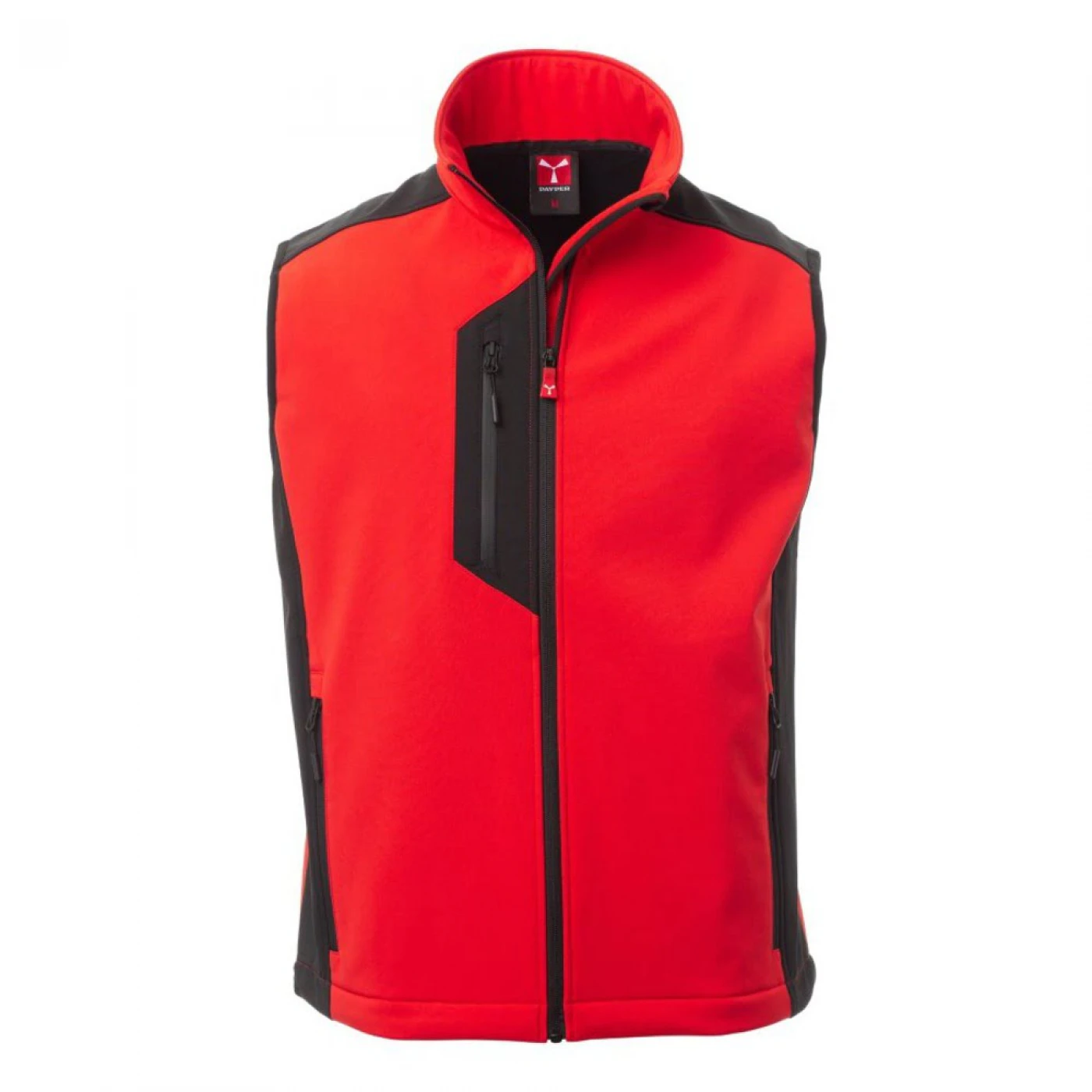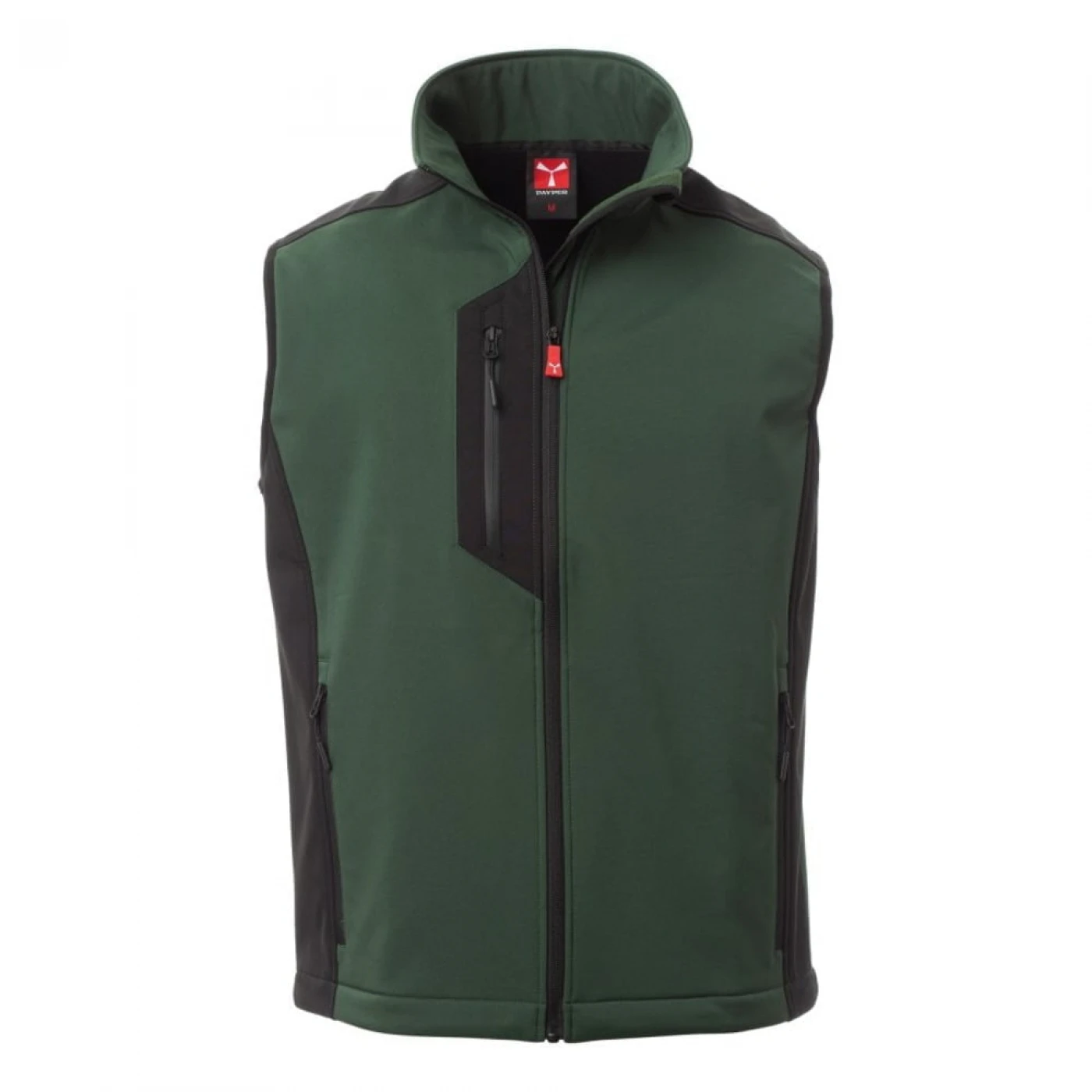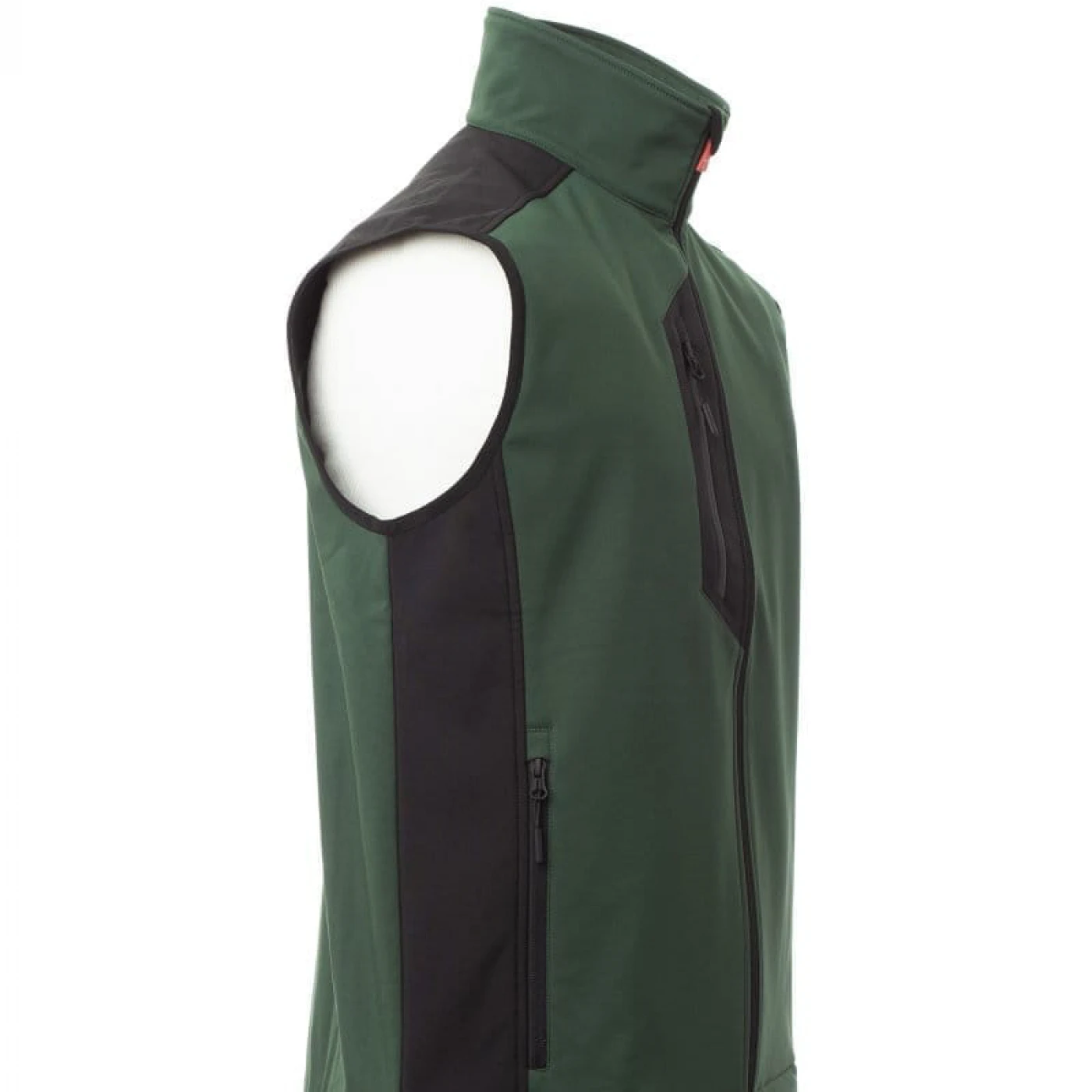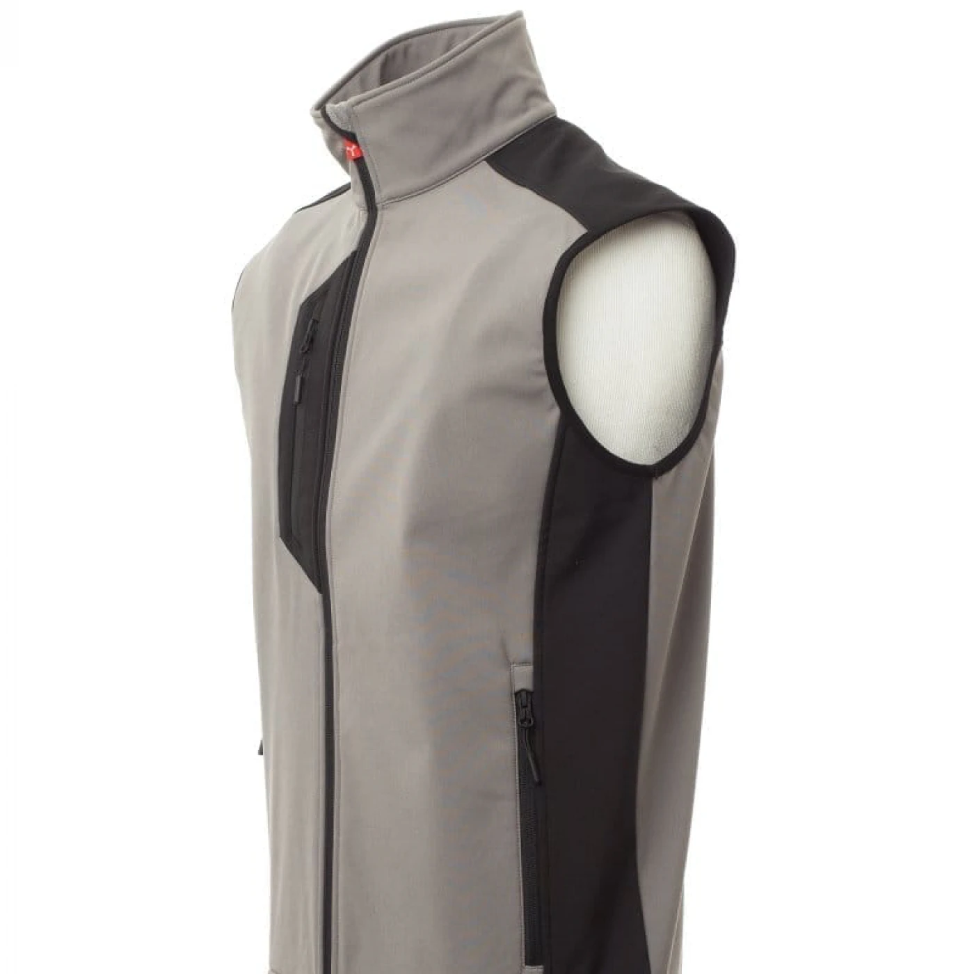 Vestă bărbați soft-shell in doua tonuri de culoare care asigura o protectie sporita impotriva vantului (windproof) si impotriva apei (waterproof - WP 8000 mm H₂O, WVT 5000 g/m² 24h). Inchidere cu fermoar lung cu glisor metalic „semi-auto lock”. Echipata cu două buzunare laterale cu fermoar si un buzunar la piept cu fermoar acoperit. Banda reflectorizanta pe partea din spate.