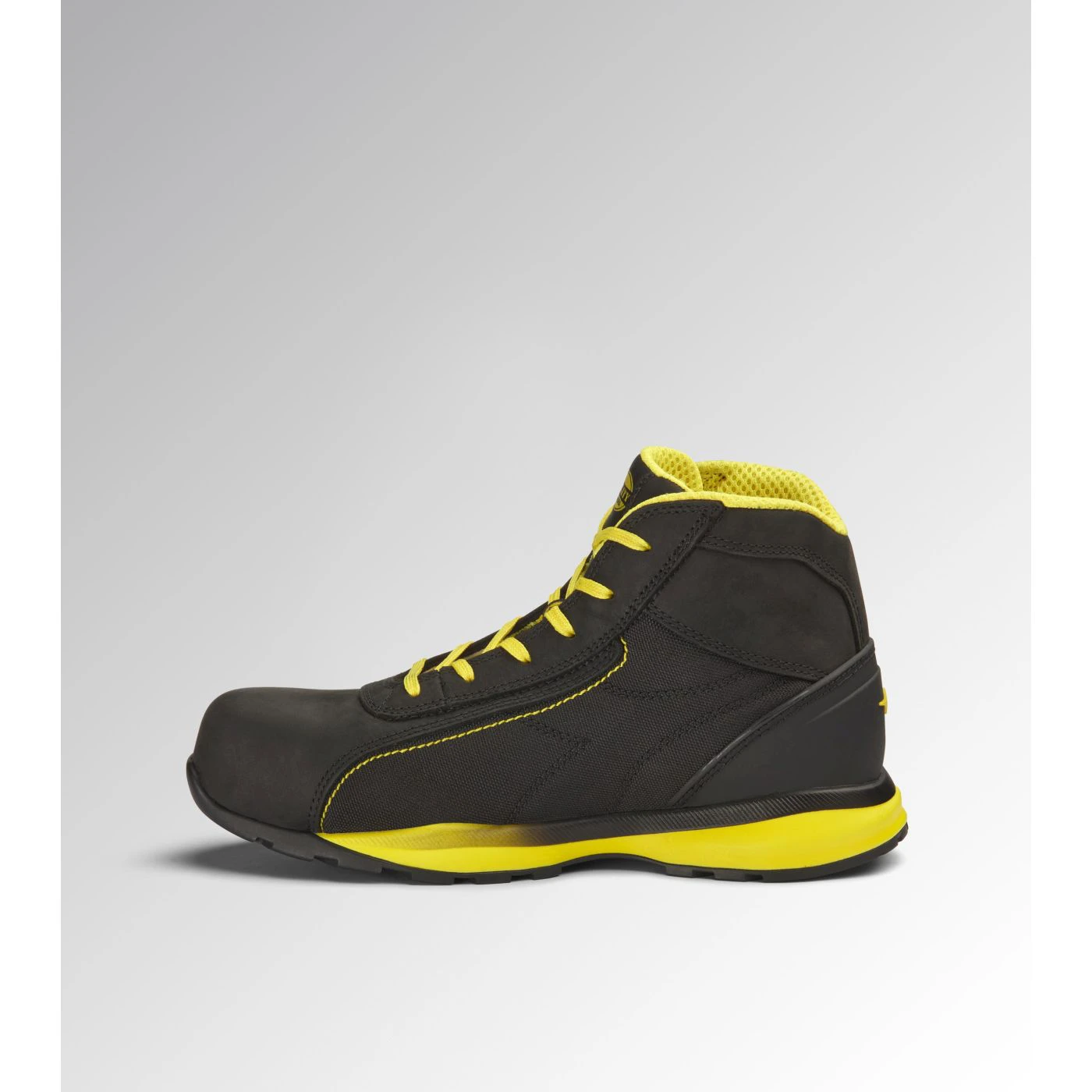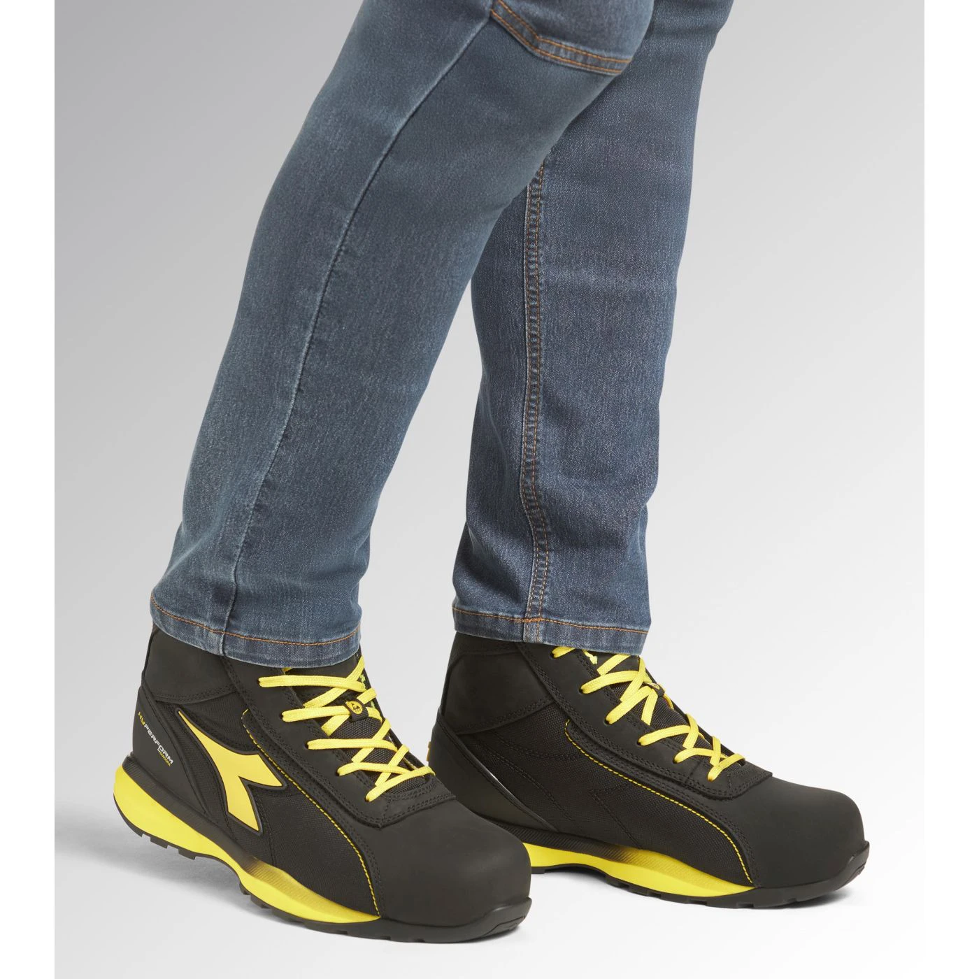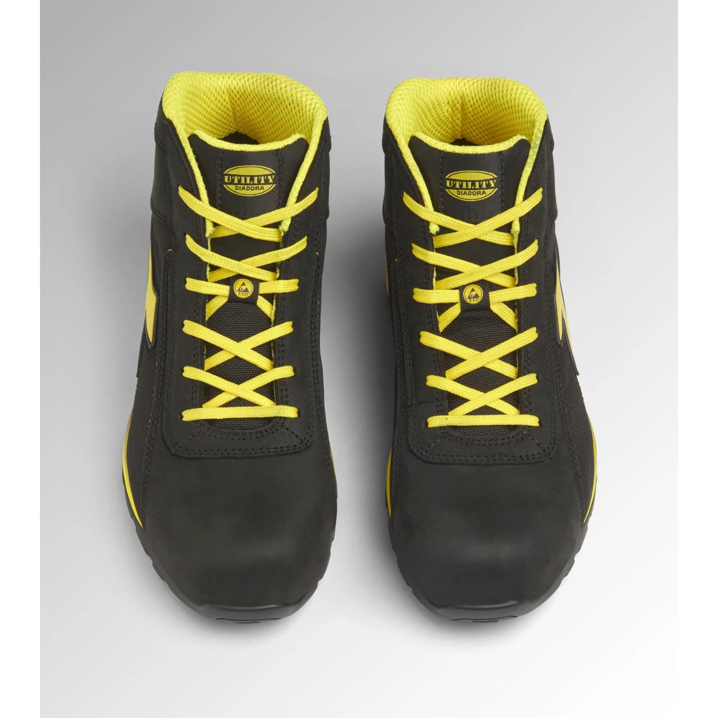 Mid-top S3S safety shoes in water-repellent and breathable polyester and cowhide nubuck. Ergonomic TPU heel support. 200J aluminium toe cap. K SOLE Ultralite anti-puncture insert. Width 11. Air Mesh lining with 65% recycled polyester and a non-slip microfibre insert. Anatomical thermoformed removable micro-perforated EVA insole. ESD.