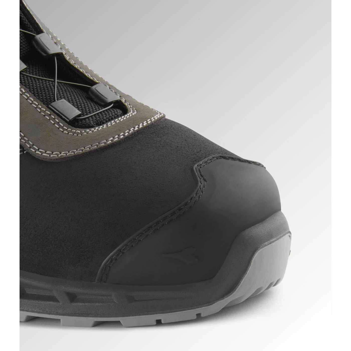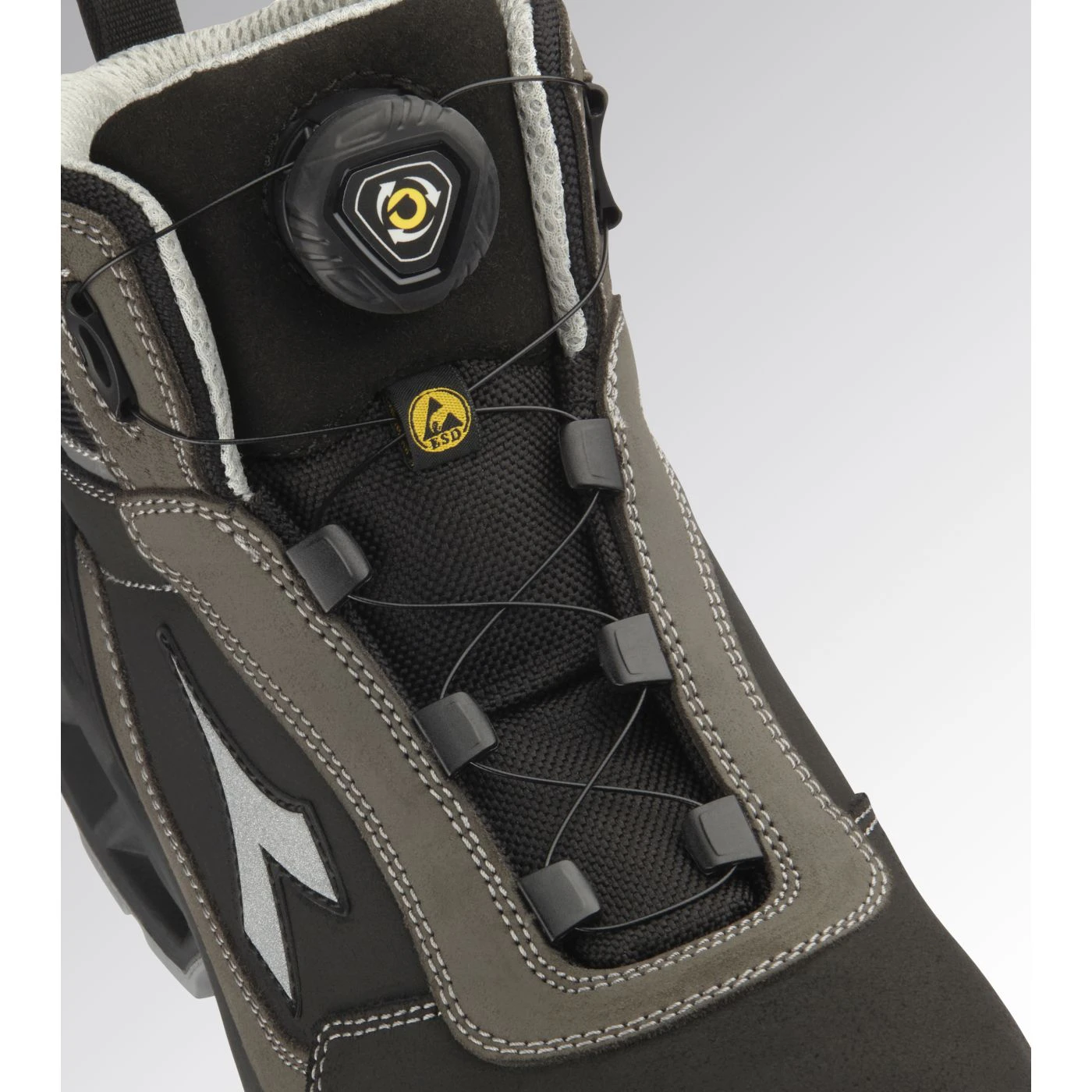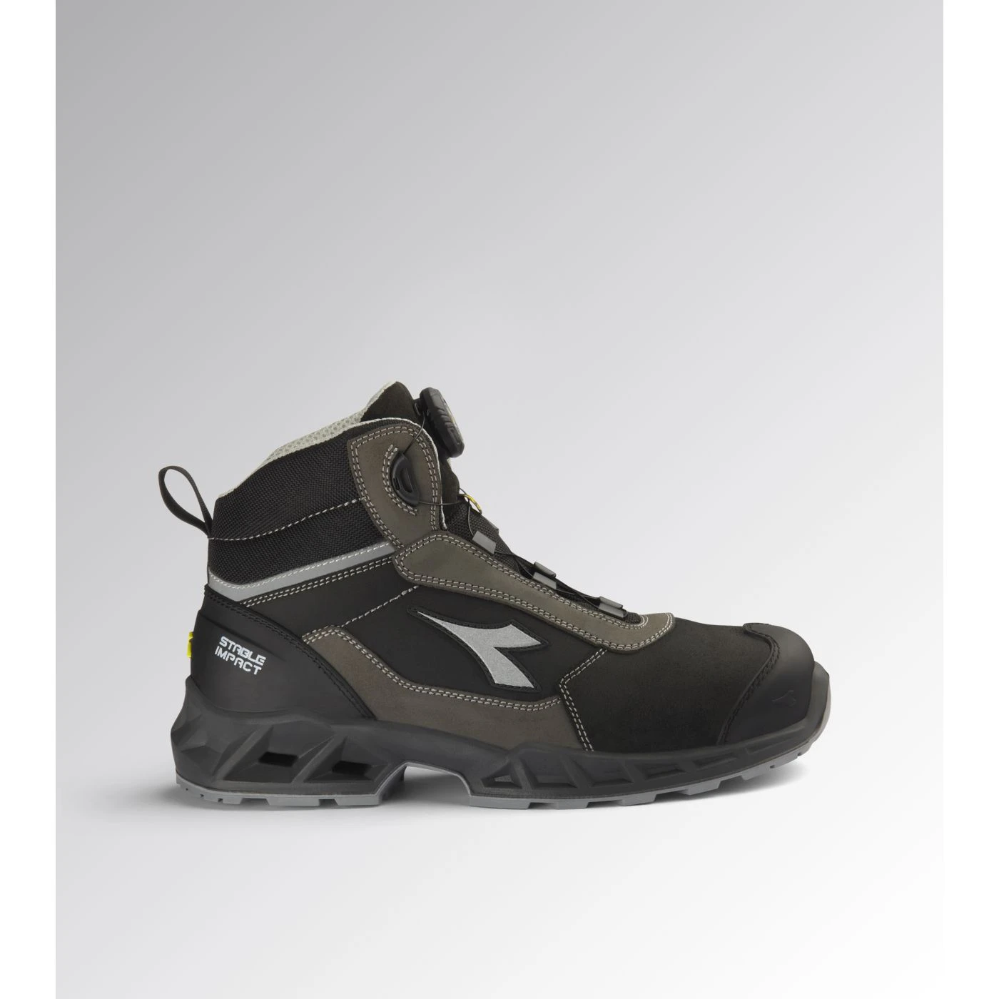 Calzatura di sicurezza mid-cut S3S idrorepellente in pelle bovina scamosciata. Supporto ergonomico del tallone e protezione della punta in TPU. Sistema di allacciatura rapida Quick Release System by Diadora. Puntale in alluminio 200J. Inserto antiperforazione K-SOLE. Calzata 11. Tecnologia di ammortizzazione Stable Impact System. Fodera in Air Mesh con antiscalzante in microfibra. Plantare anatomico microforato, antistatico estraibile in PU espanso riciclato a celle aperte, traspirante con carboni attivi. ESD.