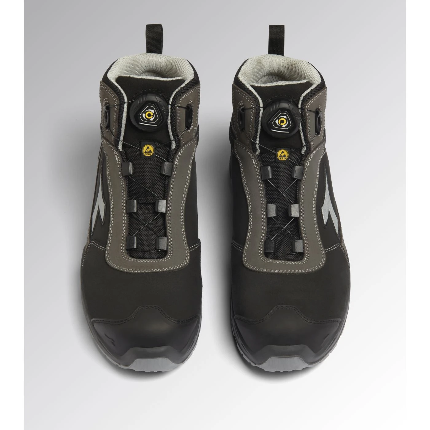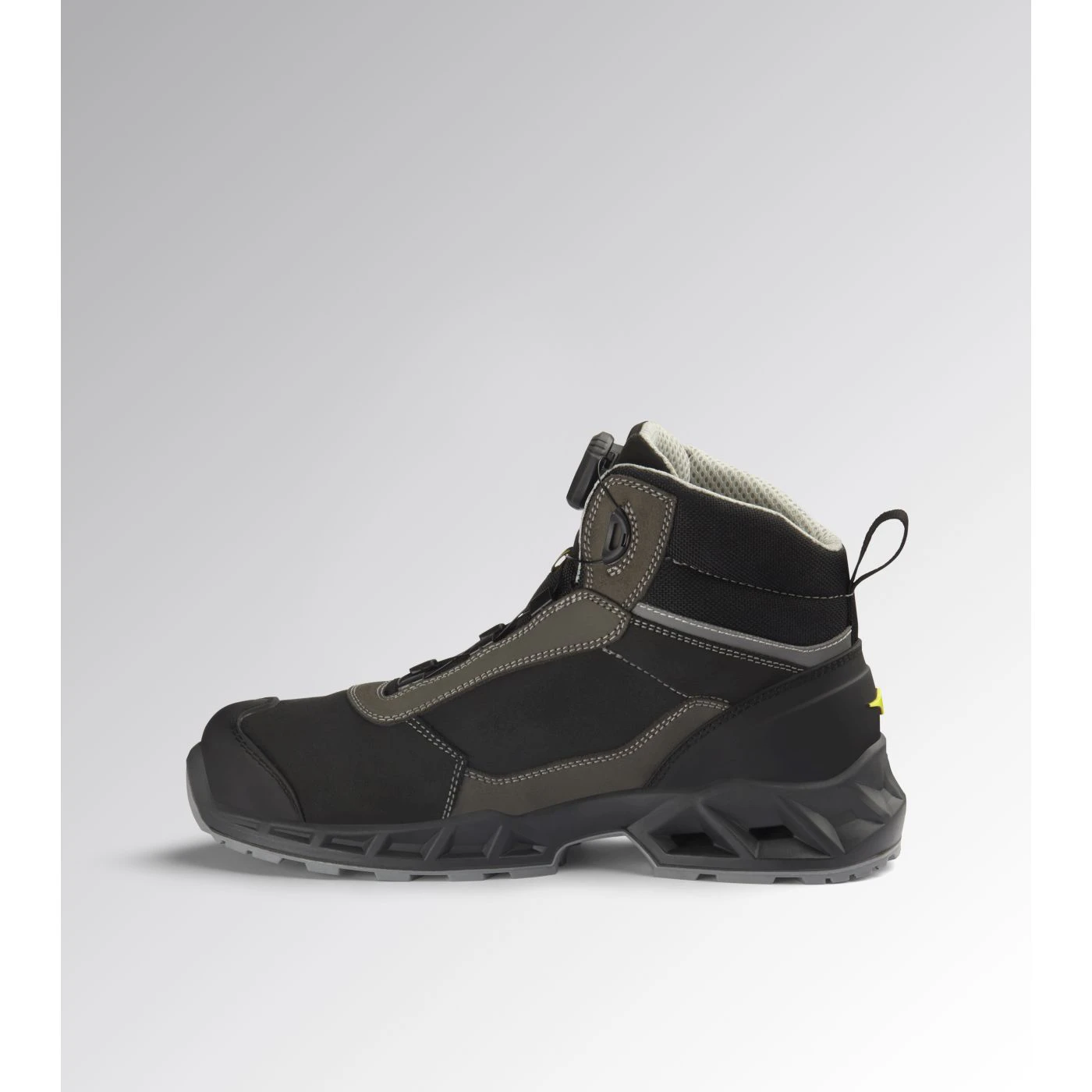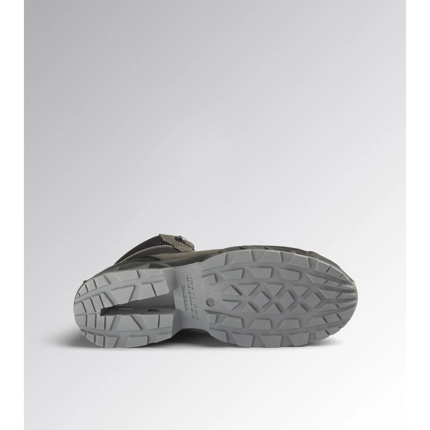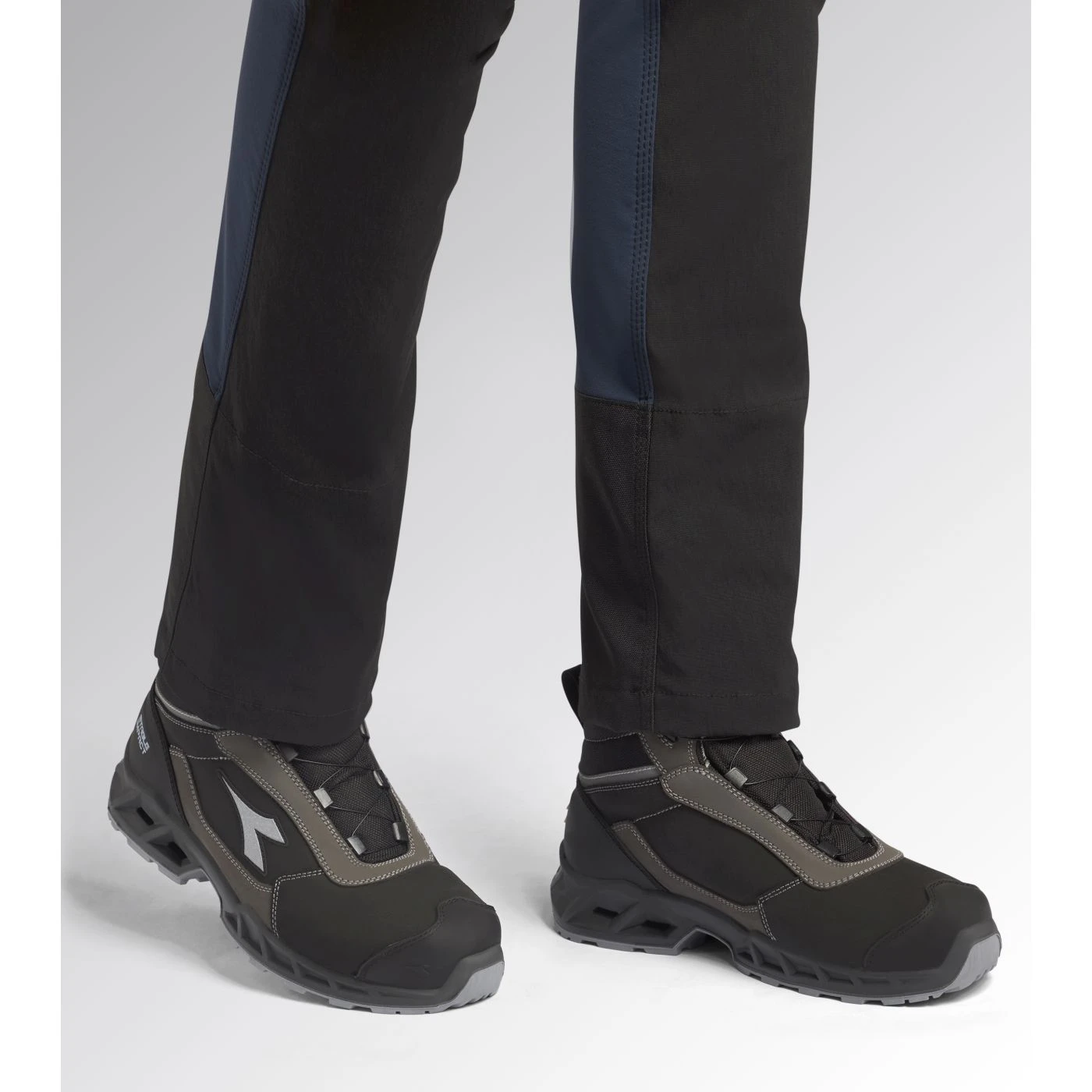 Calzatura di sicurezza mid-cut S3S idrorepellente in pelle bovina scamosciata. Supporto ergonomico del tallone e protezione della punta in TPU. Sistema di allacciatura rapida Quick Release System by Diadora. Puntale in alluminio 200J. Inserto antiperforazione K-SOLE. Calzata 11. Tecnologia di ammortizzazione Stable Impact System. Fodera in Air Mesh con antiscalzante in microfibra. Plantare anatomico microforato, antistatico estraibile in PU espanso riciclato a celle aperte, traspirante con carboni attivi. ESD.