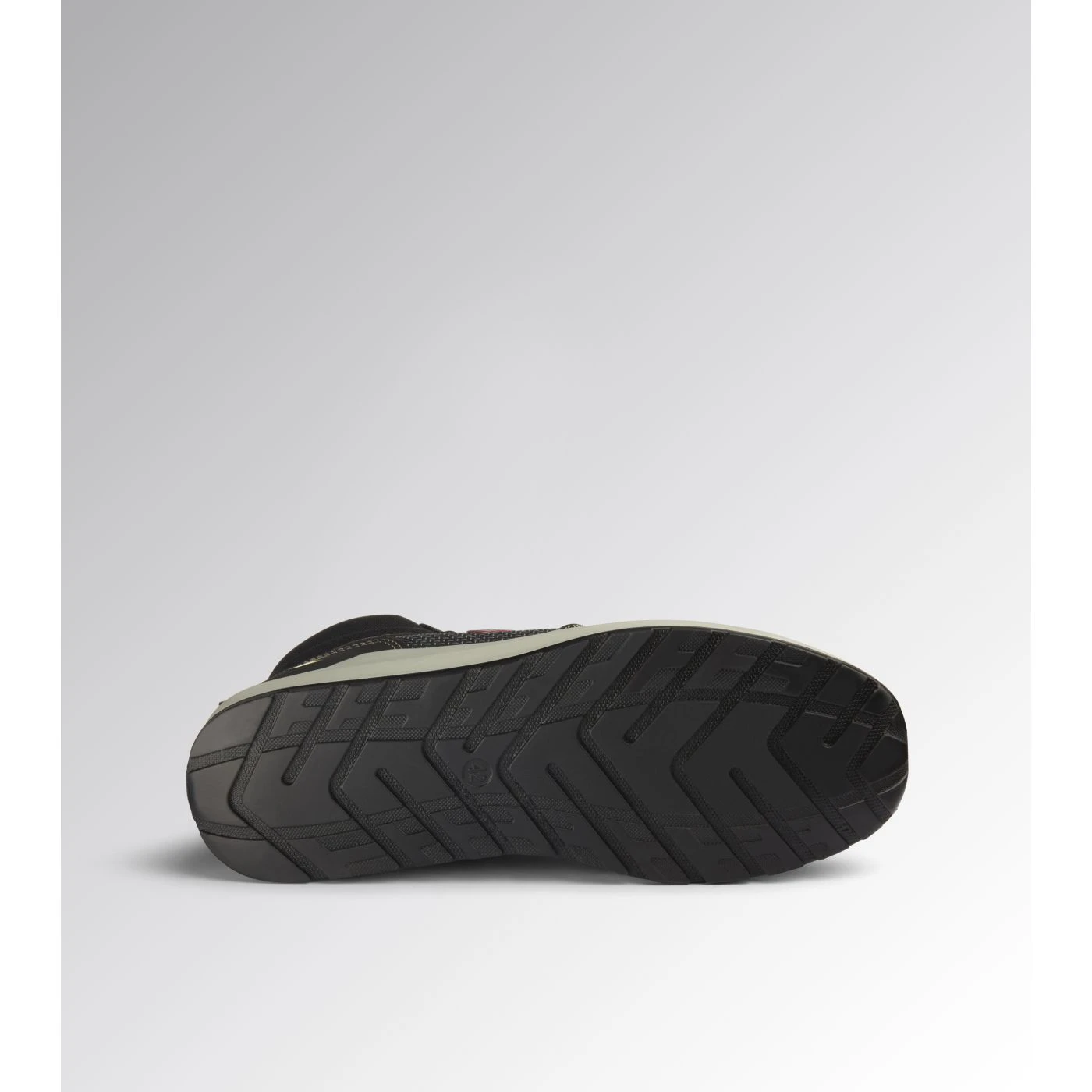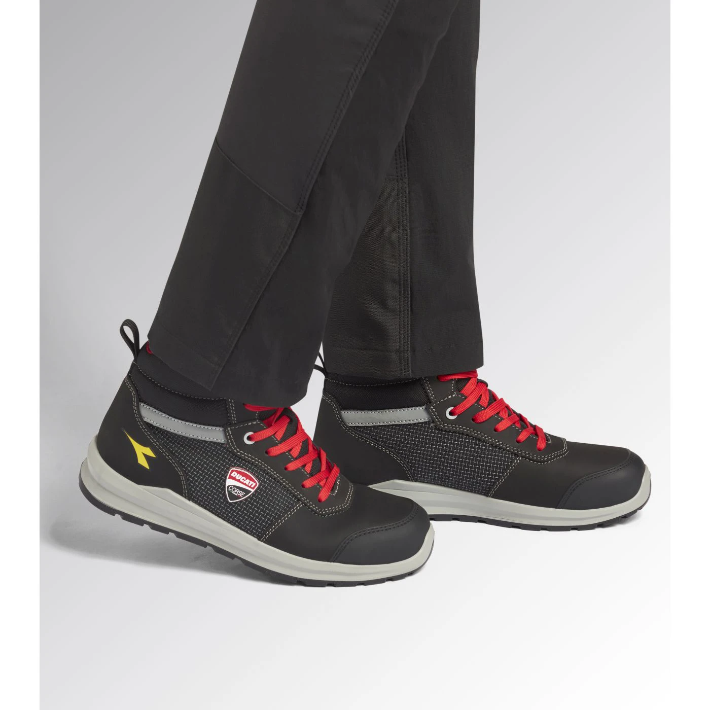 Calzatura di sicurezza mid-cut S3S idrorepellente in Action Nubuck, pelle bovina scamosciata rivestita da un film poliuretanico protettivo finitura Nubuck e Atom, tessuto poliestere con filati di rinforzo in poliuretano. Personalizzazione DUCATI CORSE. Protezione della punta in TPU. Puntale in Multilayer 200J. Inserto antiperforazione K-SOLE. Calzata 11,5. Fodera in Air Mesh. Plantare estraibile microforato in PU espanso a celle aperte, traspirante con carboni attivi. Metal free.