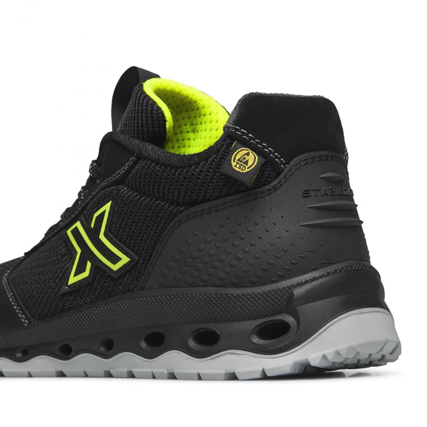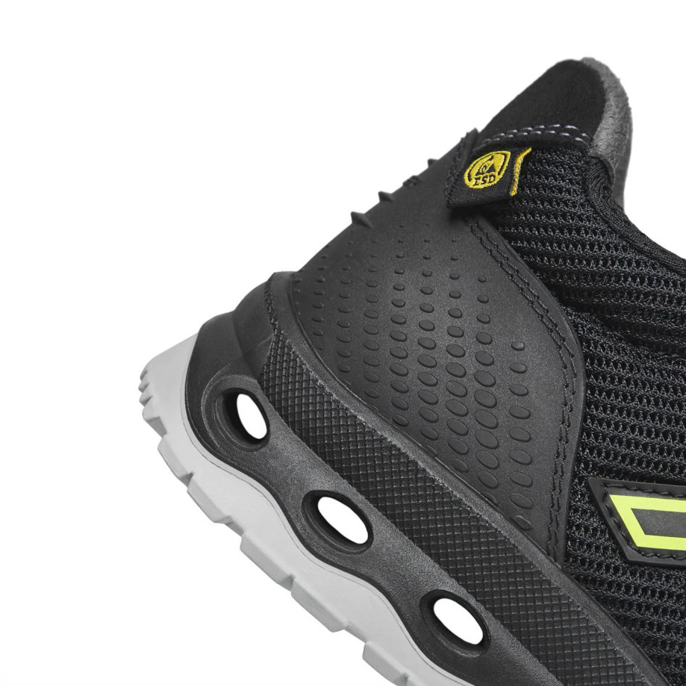 Pantofi de protectie S1P ESD SRC din material textil respirabil si spalt (piele intoarsa) moale. Protectia piciorului este asigurata de bombeul de protectie din aluminiu si lamela antiperforatie nemetalica. Foarte confortabili datorita captuselii tip ciorap din material textil perforat rezistent la abraziune si brantului din poliuretan moale antistatic, antibacterian caracterizat printr-o bula in zona calcaiului care ofera o revenire continua a energiei. Talpa inovativa este din poliuretan injectat dubla densitate. Datorita tratamentului special aplicat asigura protectie impotriva descarcarilor electrostatice, protejand astfel componentele sensibile ale sistemelor electronice.