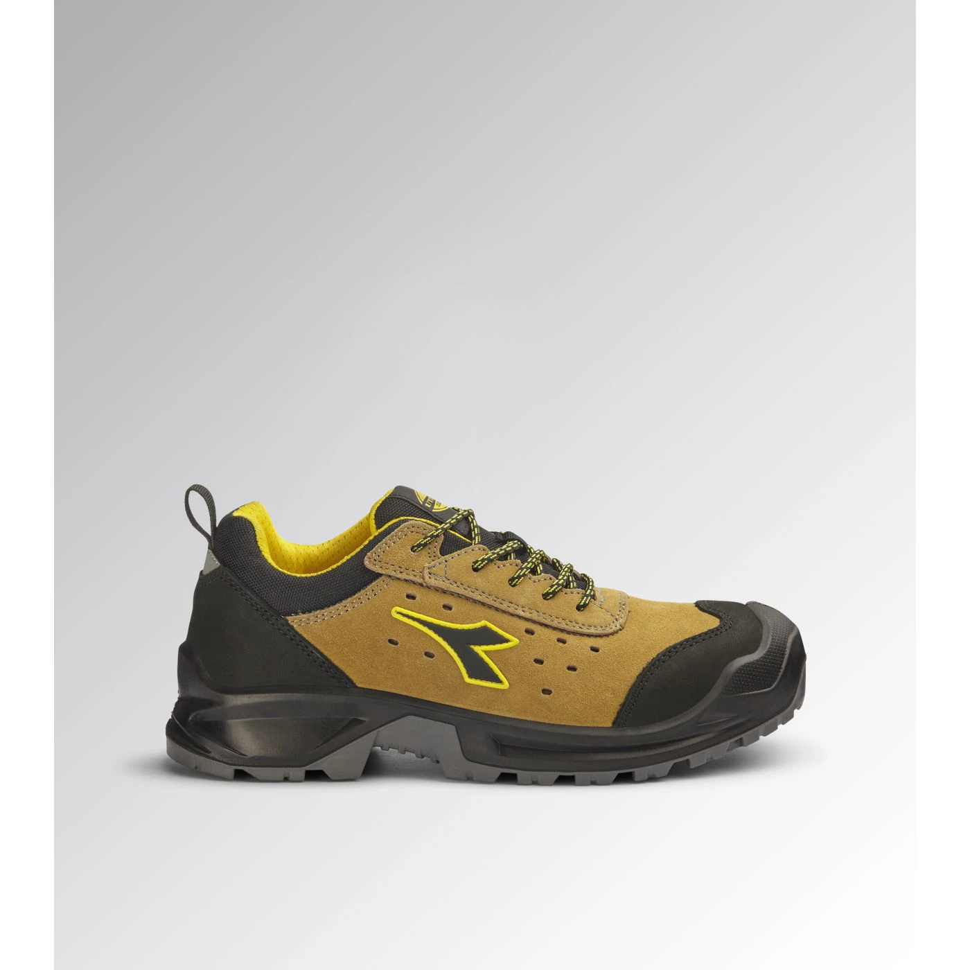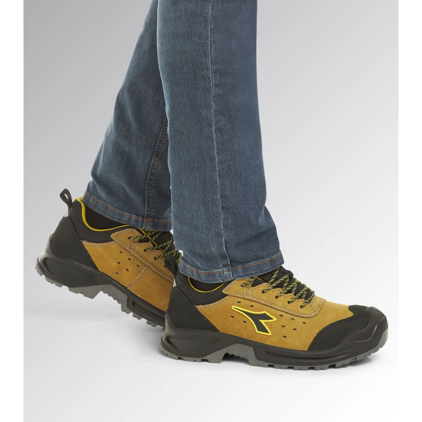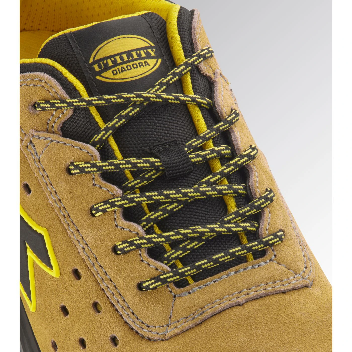 Low-cut S1P safety shoes in perforated cowhide suede. 200J steel toe cap. Width 11. Air Mesh lining. Anti-puncture K-SOLE insert. Removable micro-perforated insole in open-cell PU foam that is breathable thanks to activated carbon.