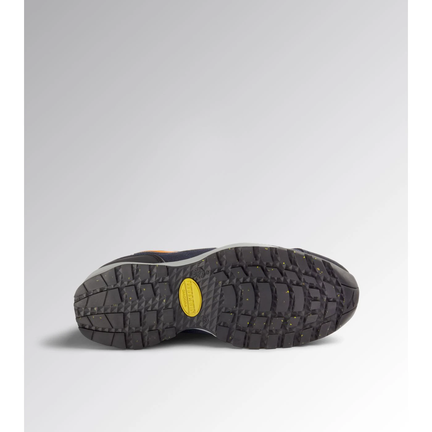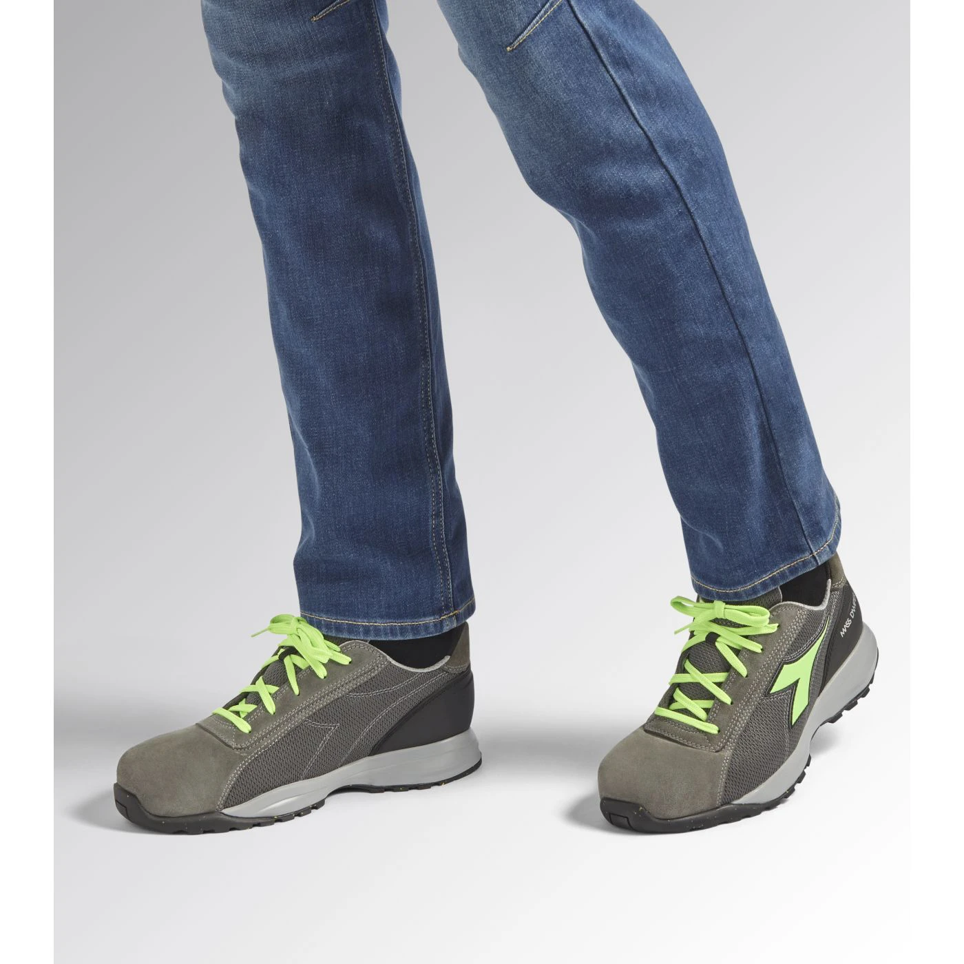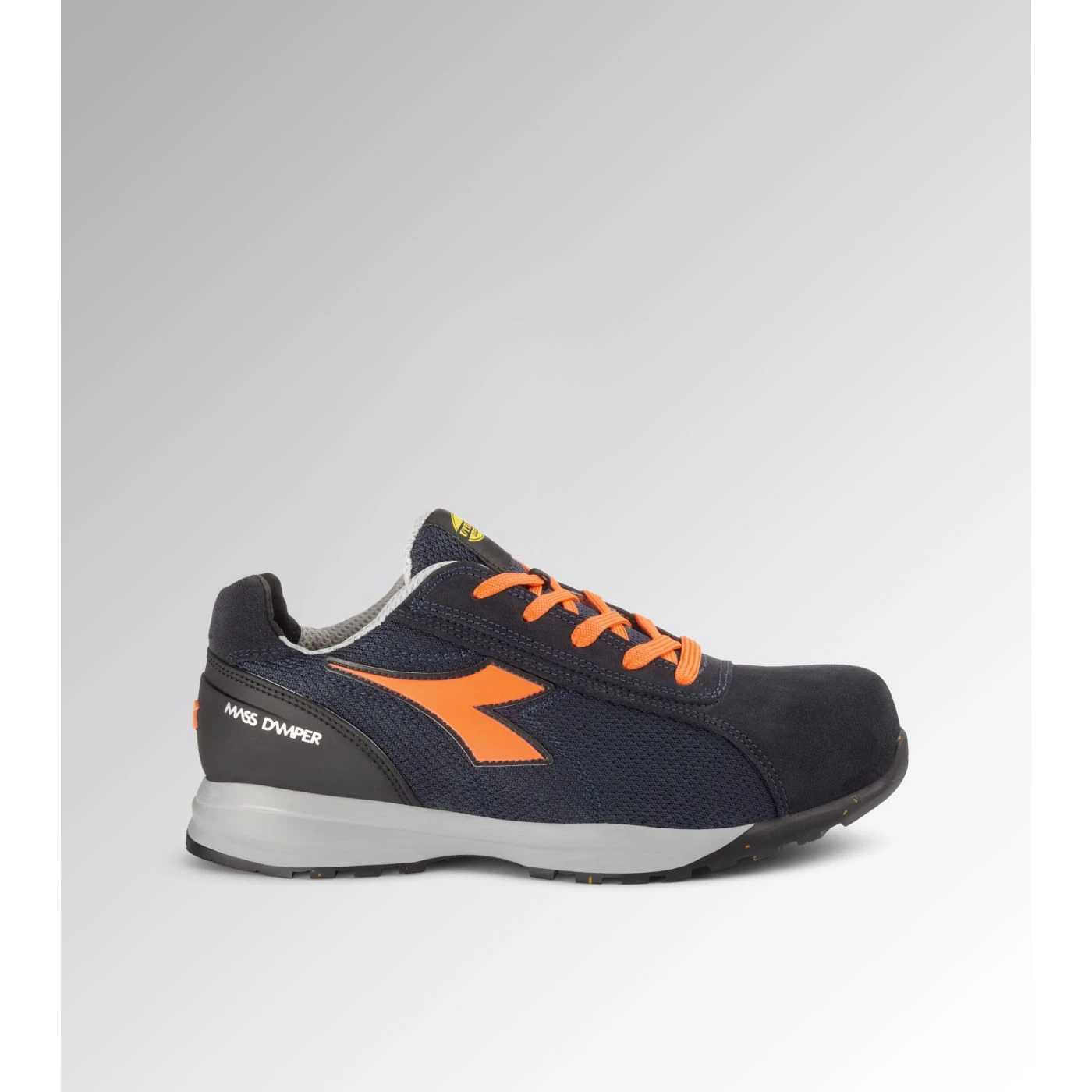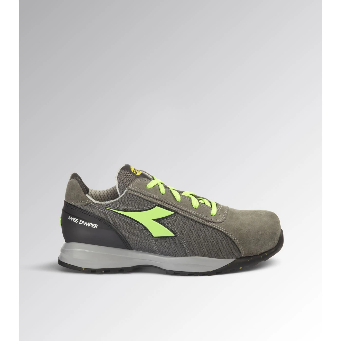 Low-cut S1PS safety shoes in cowhide suede and 100% recycled polyester fabric. Ergonomic TPU heel support. 200J aluminium toe cap. Anti-puncture K-SOLE insert. Width 11. Mass Damper System technology. Air mesh lining with a non-slip microfibre insert. Removable ergonomic insole in PU foam and activated carbon.