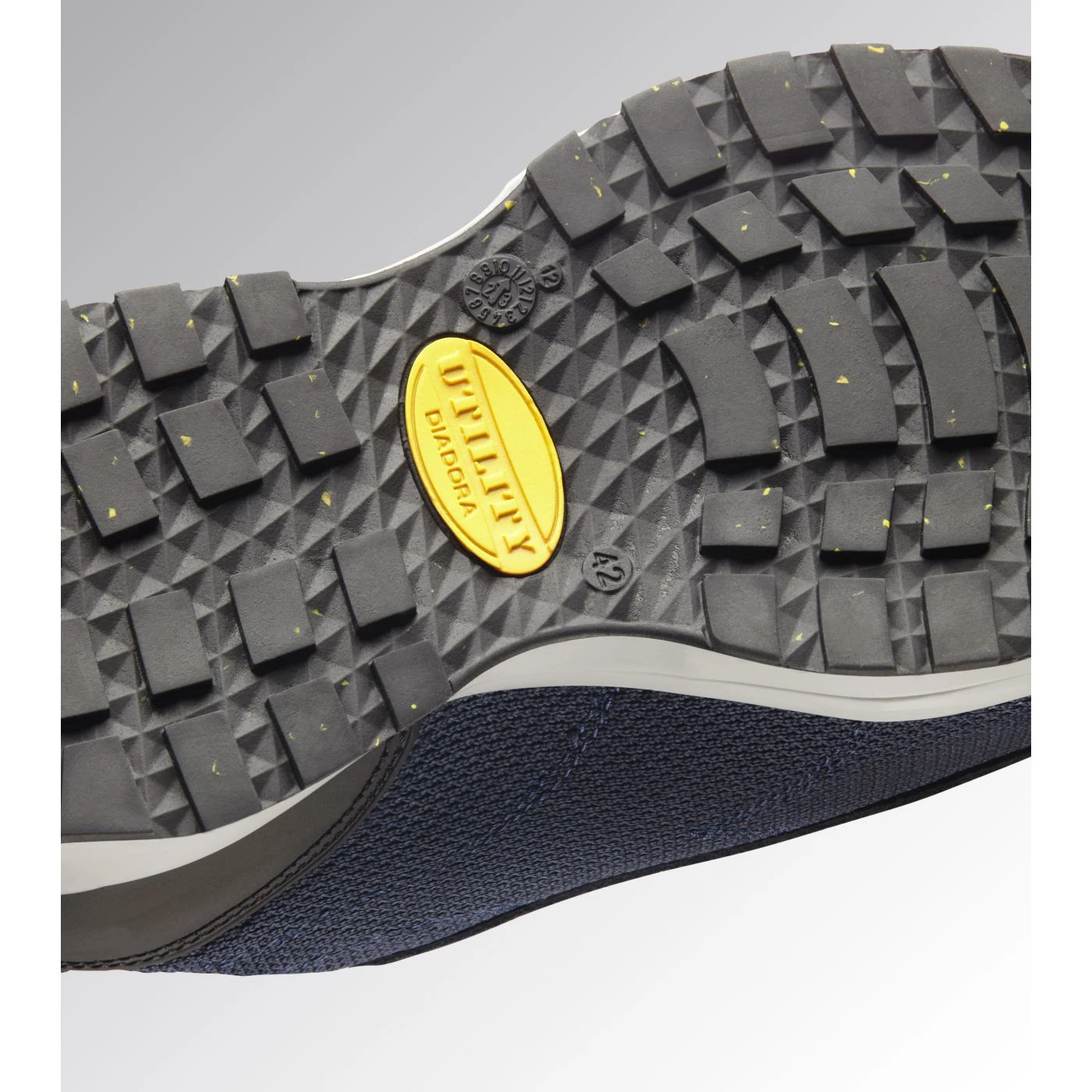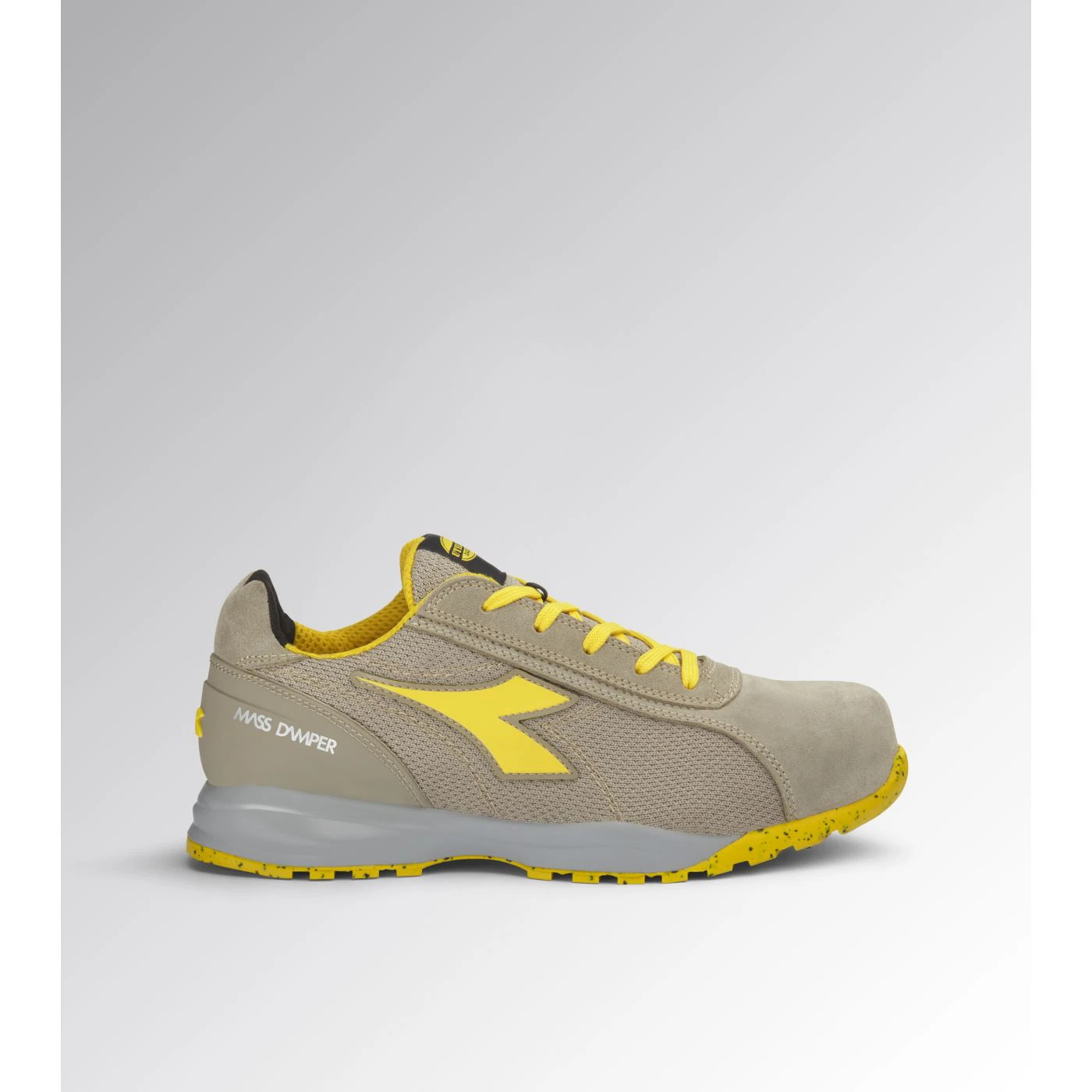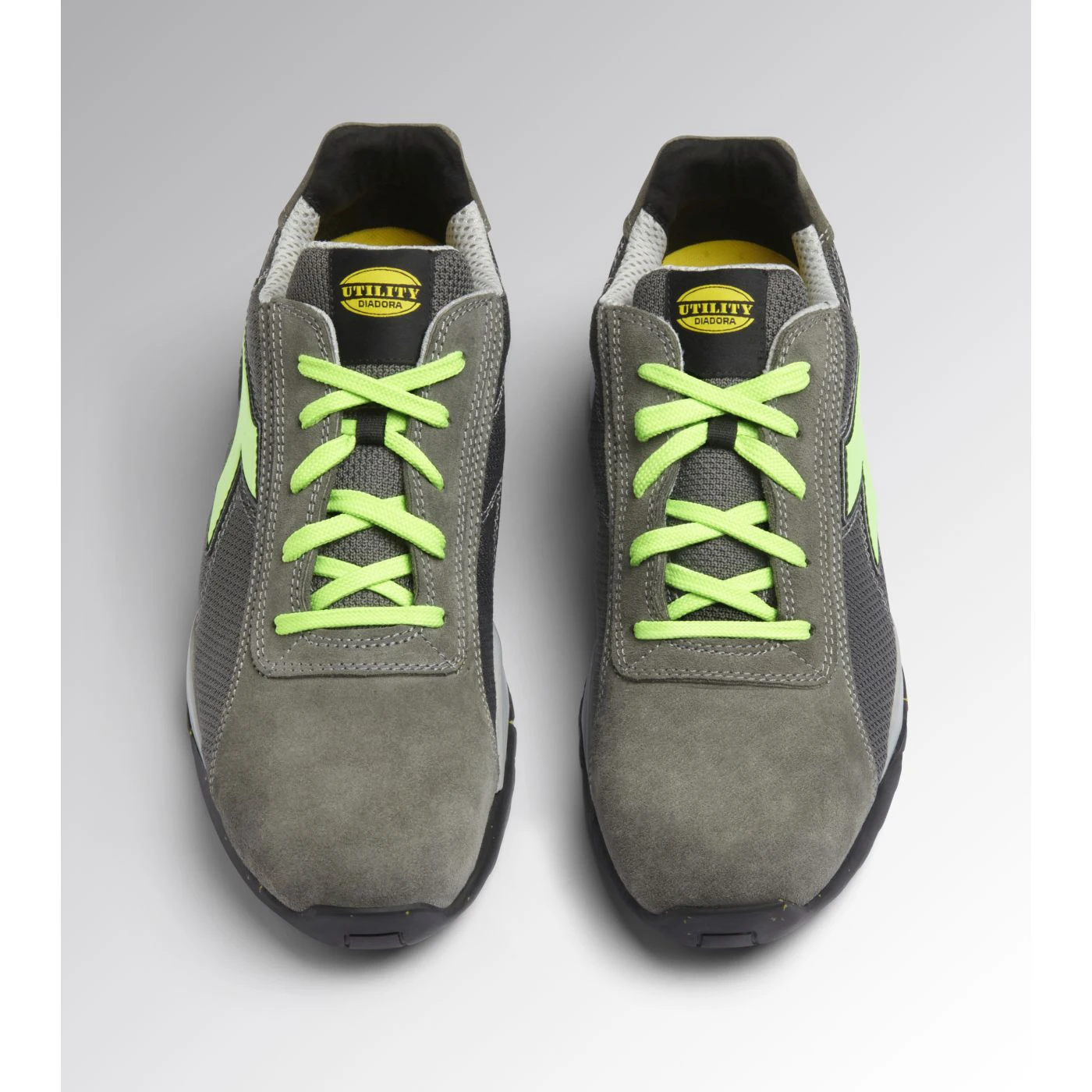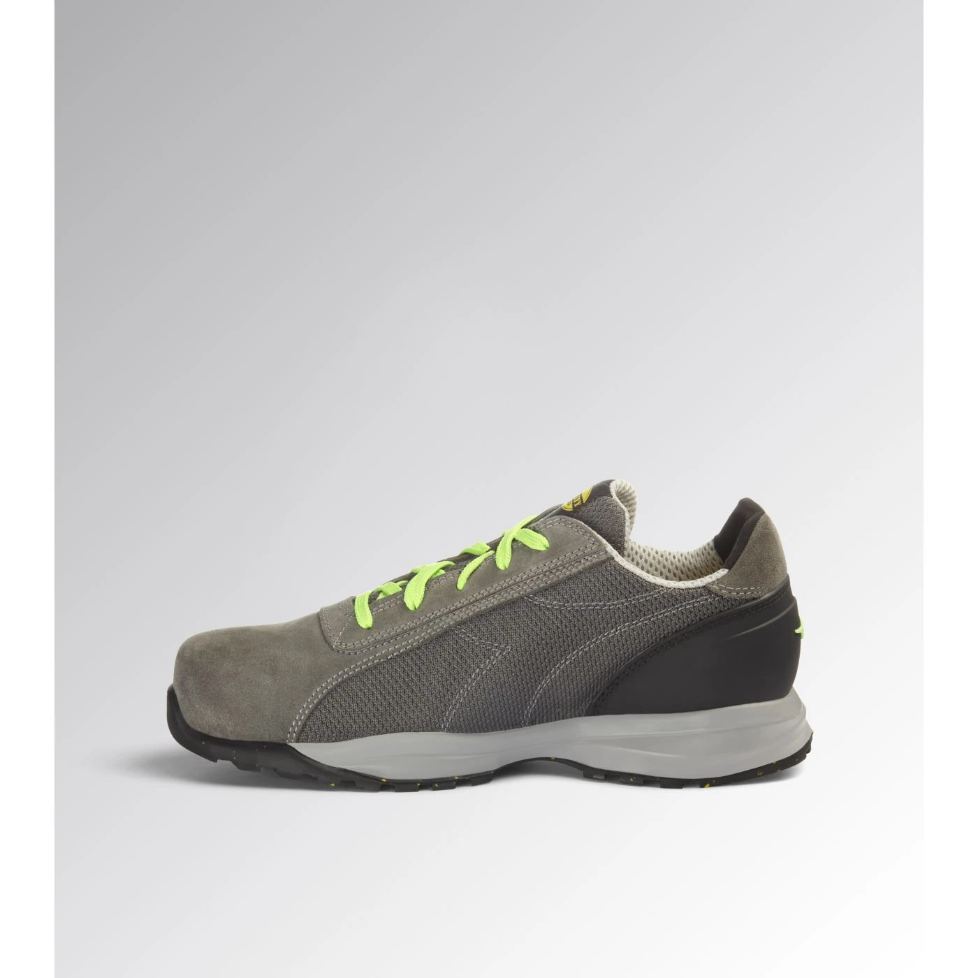 Low-cut S1PS safety shoes in cowhide suede and 100% recycled polyester fabric. Ergonomic TPU heel support. 200J aluminium toe cap. Anti-puncture K-SOLE insert. Width 11. Mass Damper System technology. Air mesh lining with a non-slip microfibre insert. Removable ergonomic insole in PU foam and activated carbon.