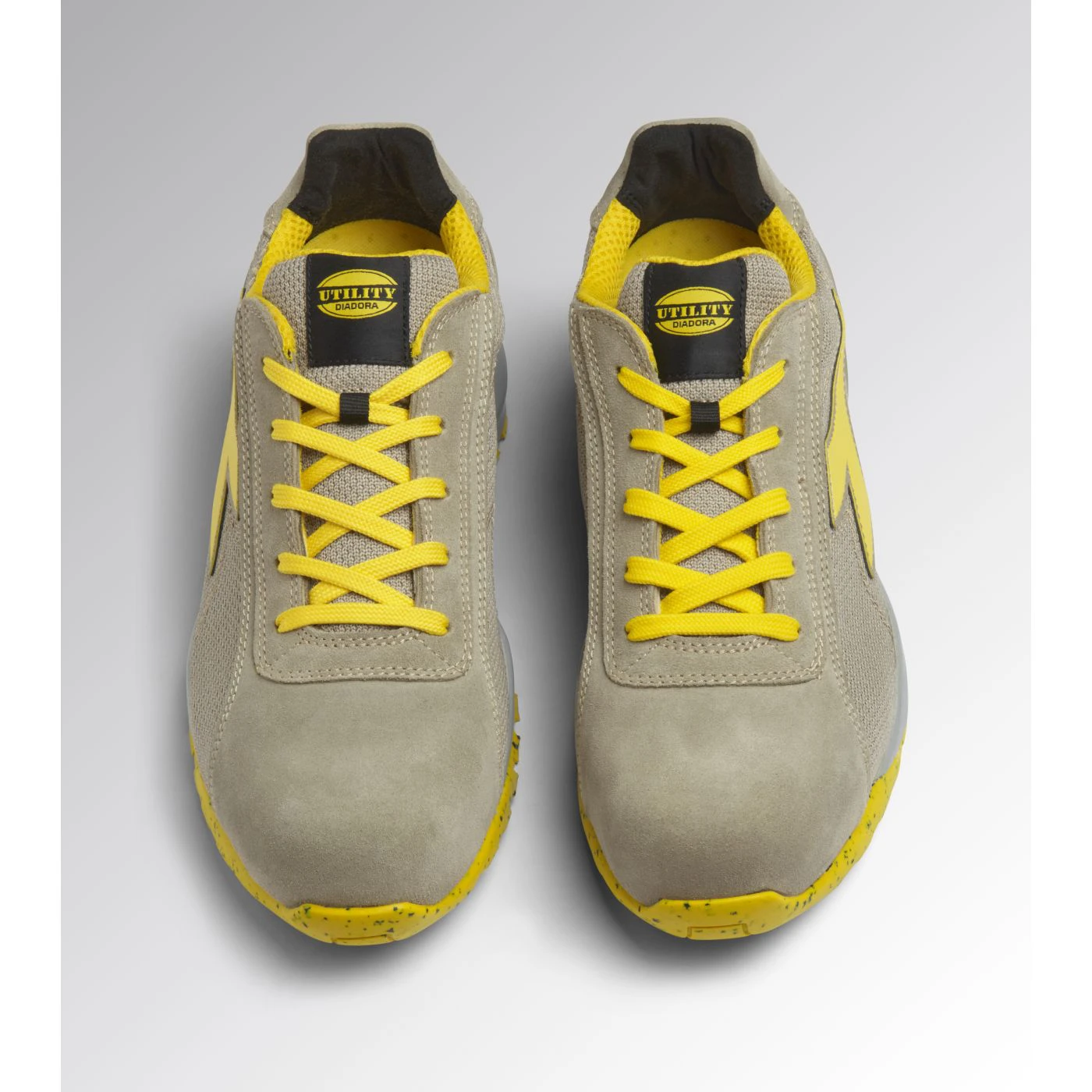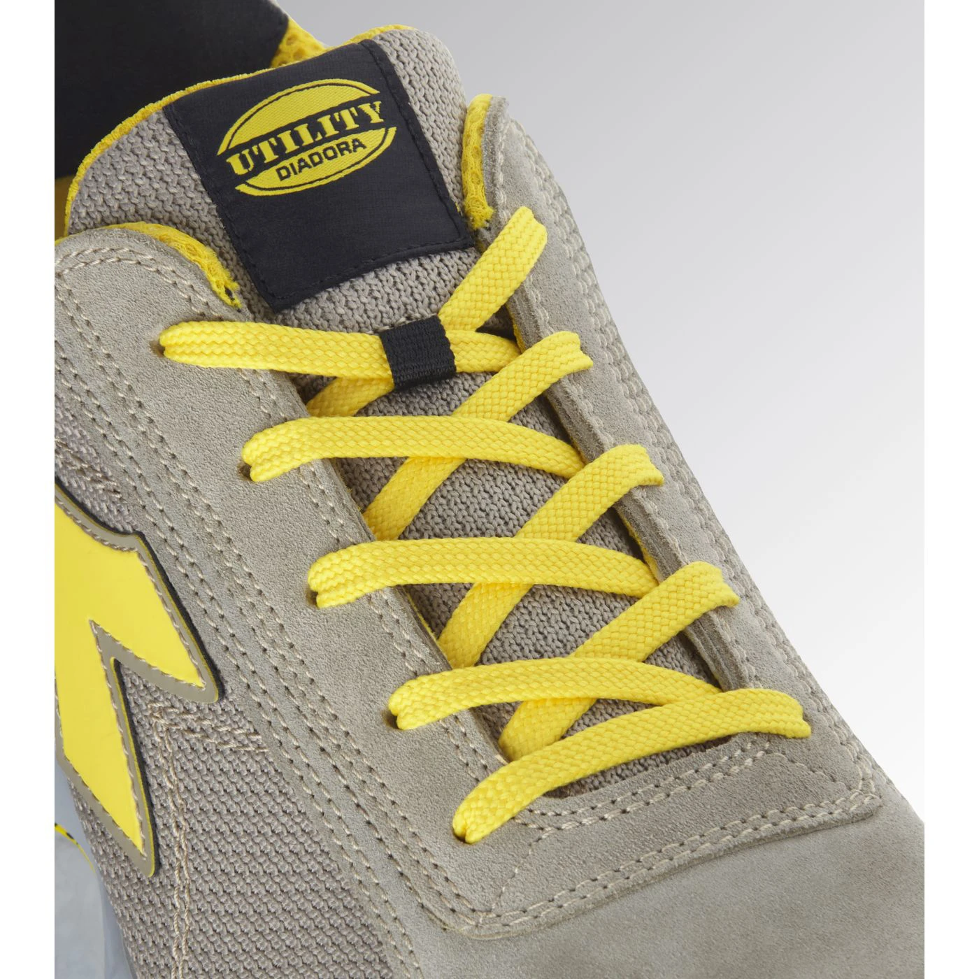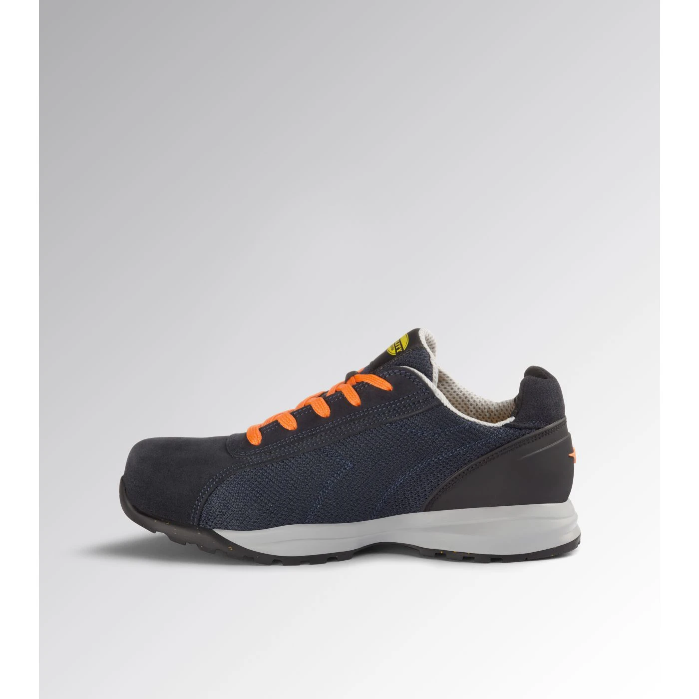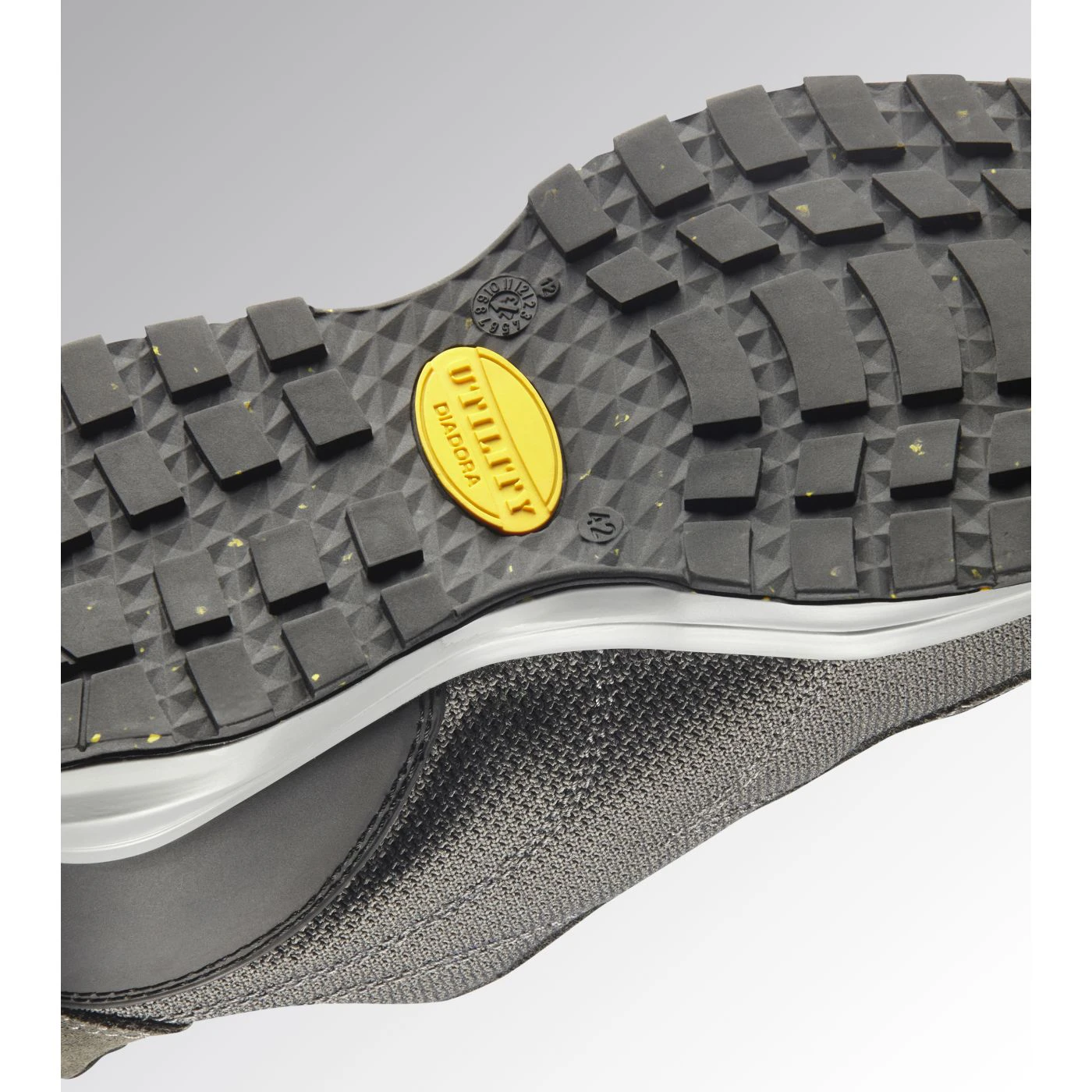 Low-cut S1PS safety shoes in cowhide suede and 100% recycled polyester fabric. Ergonomic TPU heel support. 200J aluminium toe cap. Anti-puncture K-SOLE insert. Width 11. Mass Damper System technology. Air mesh lining with a non-slip microfibre insert. Removable ergonomic insole in PU foam and activated carbon.