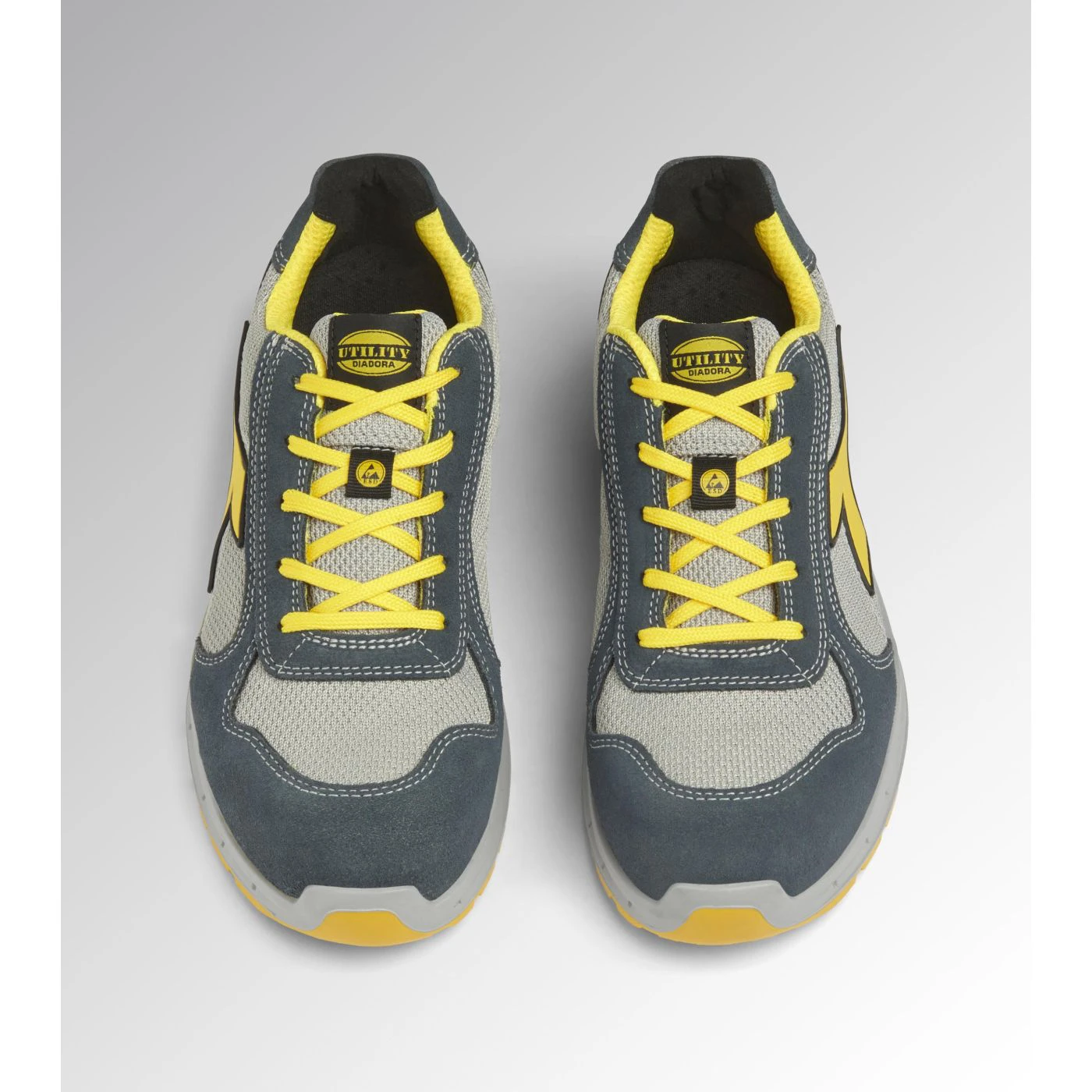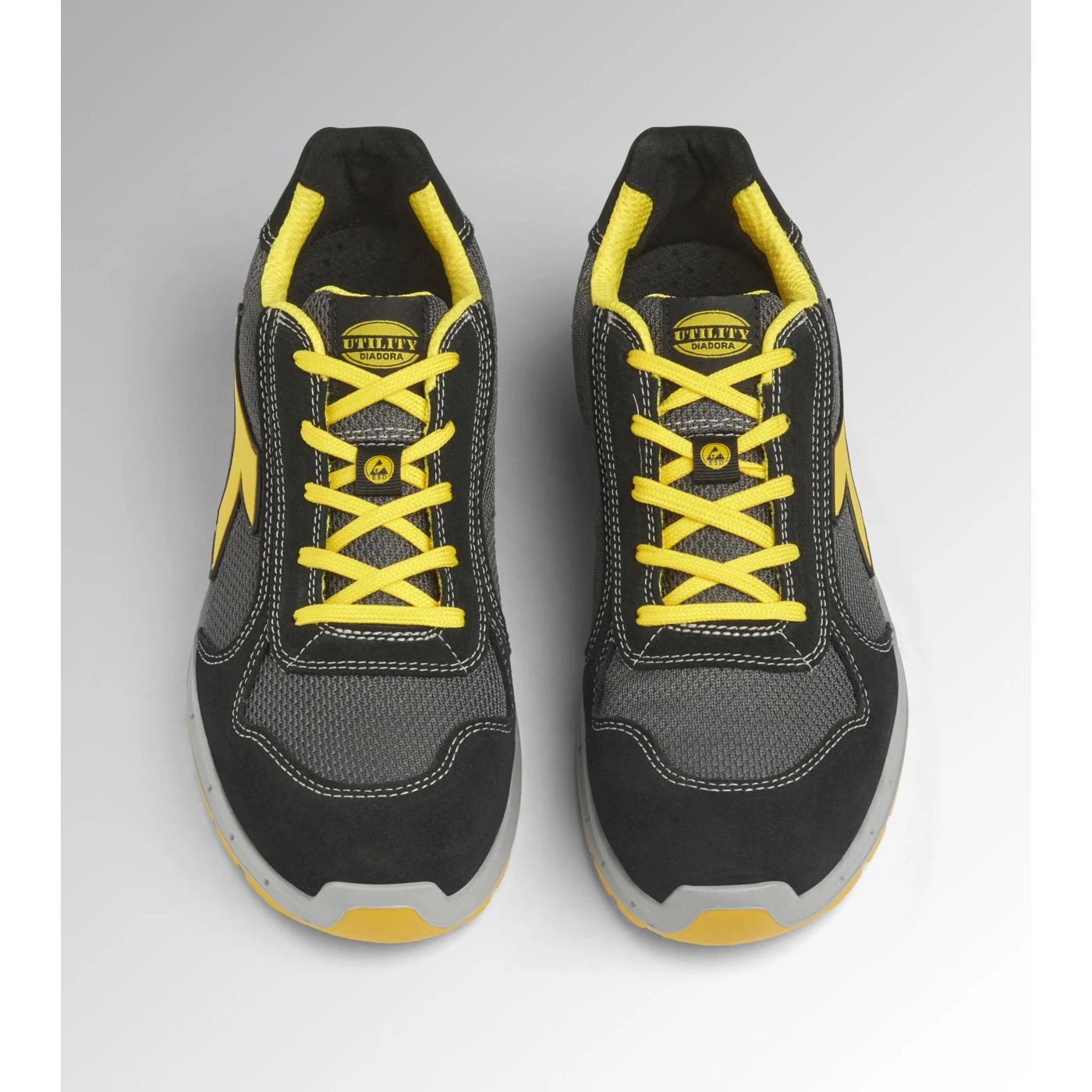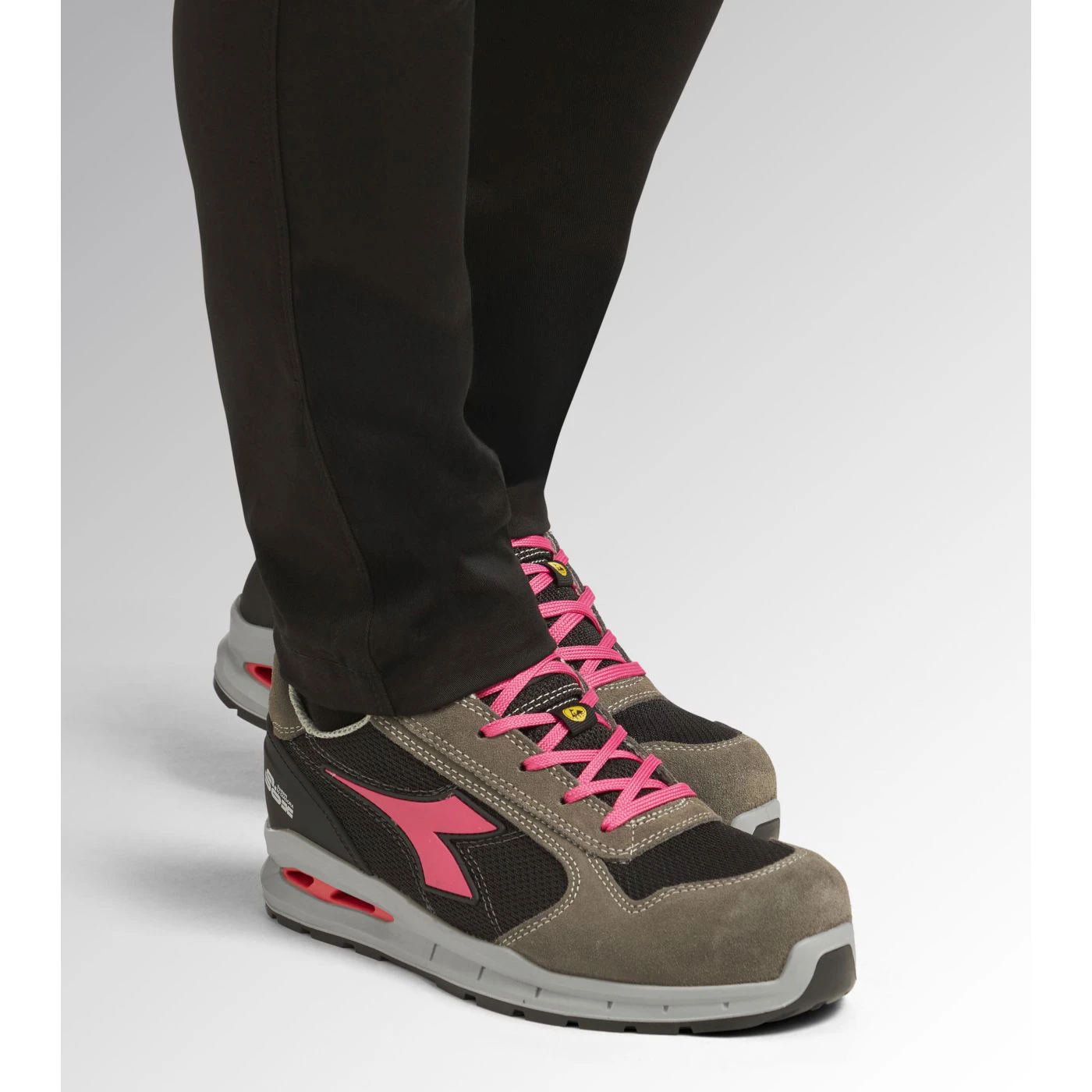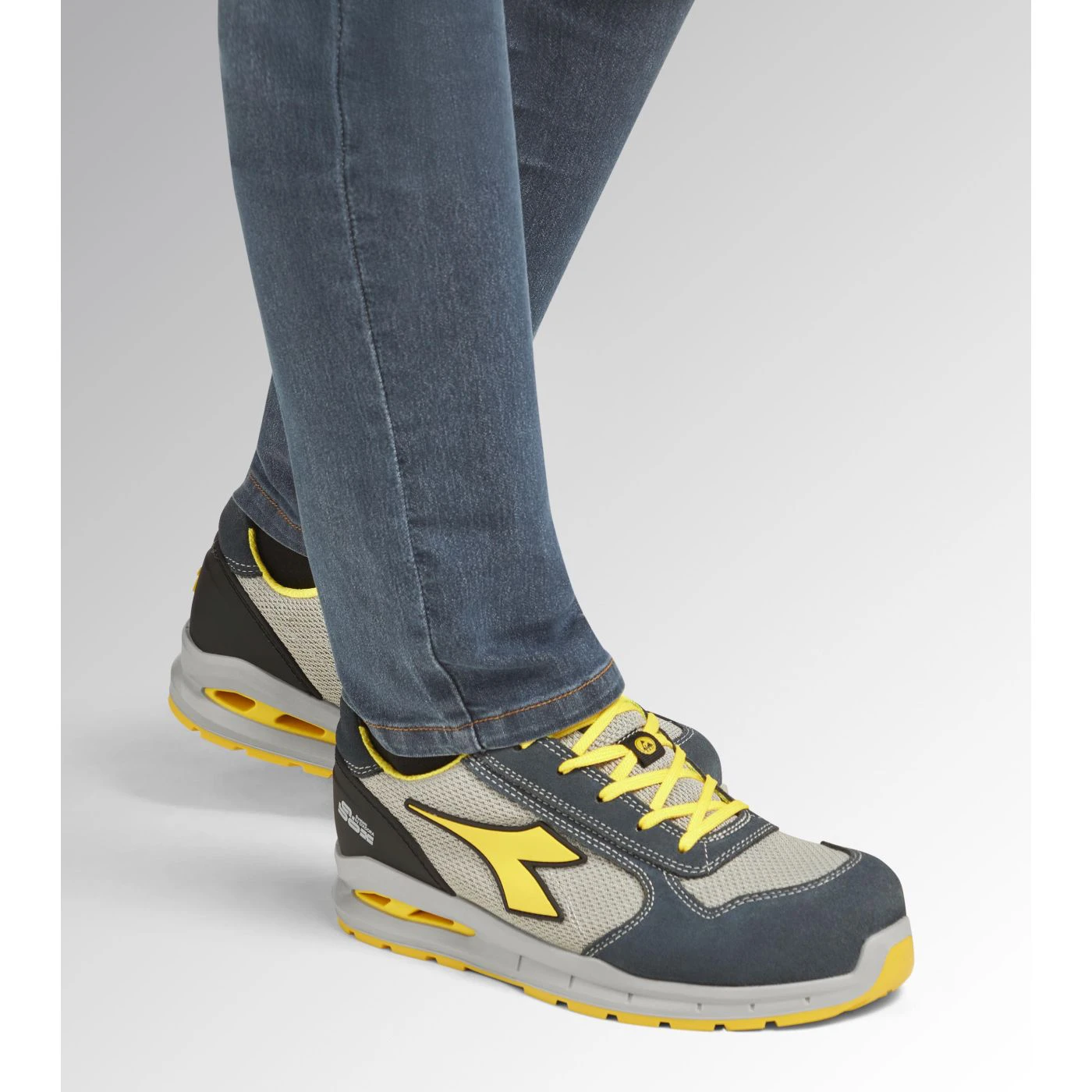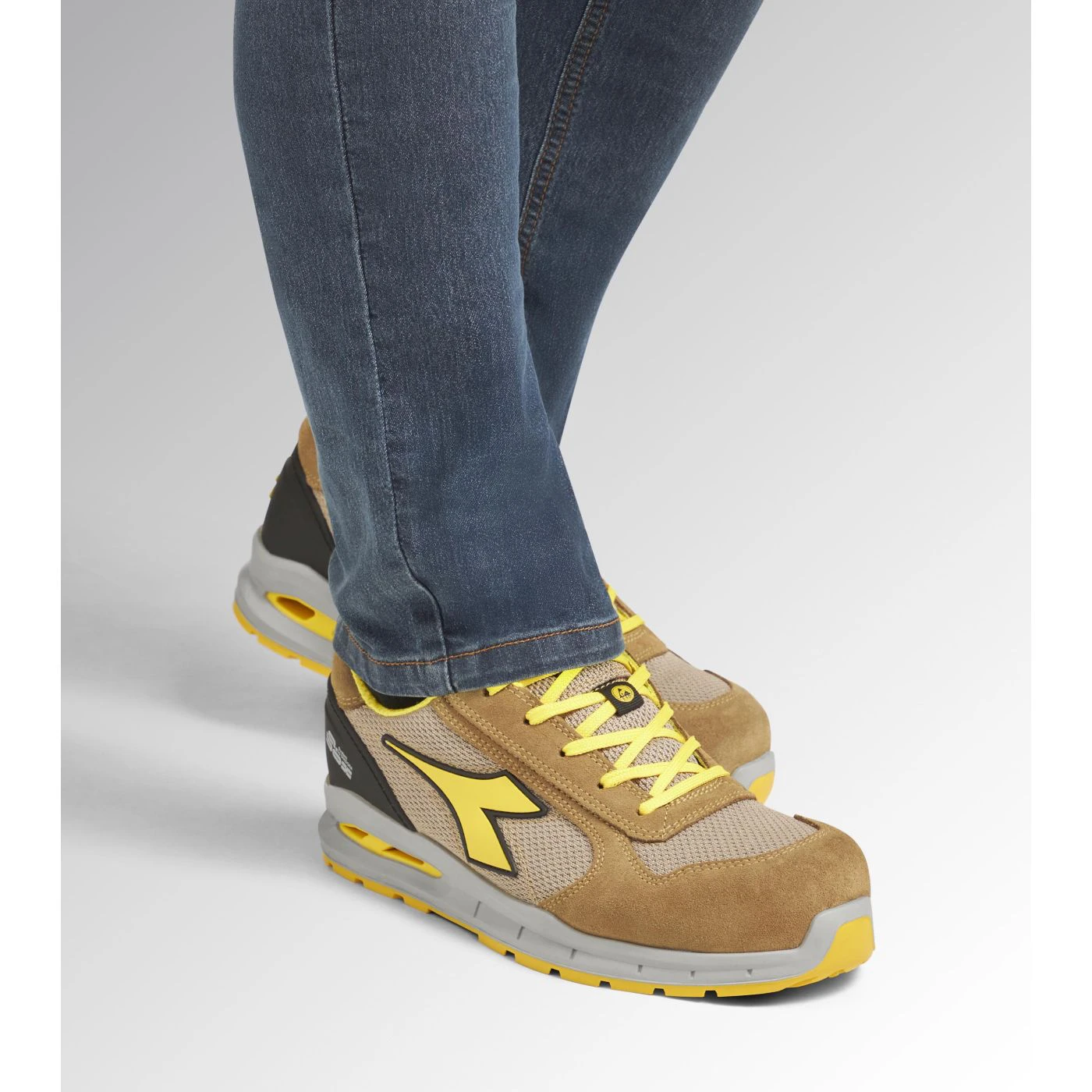 Low-top S1PS safety shoes in cowhide suede and 80% recycled, breathable polyester mesh. Ergonomic TPU heel support. 200J aluminium toe cap. K SOLE Ultralite anti-puncture insert. Width 11. A.Box System technology by Diadora with side breathability and Ariatex membrane. Air Mesh lining with 65% recycled polyester and a non-slip microfibre insert. Removable micro-perforated anatomical insole in open-cell PU foam with activated carbon. ESD.