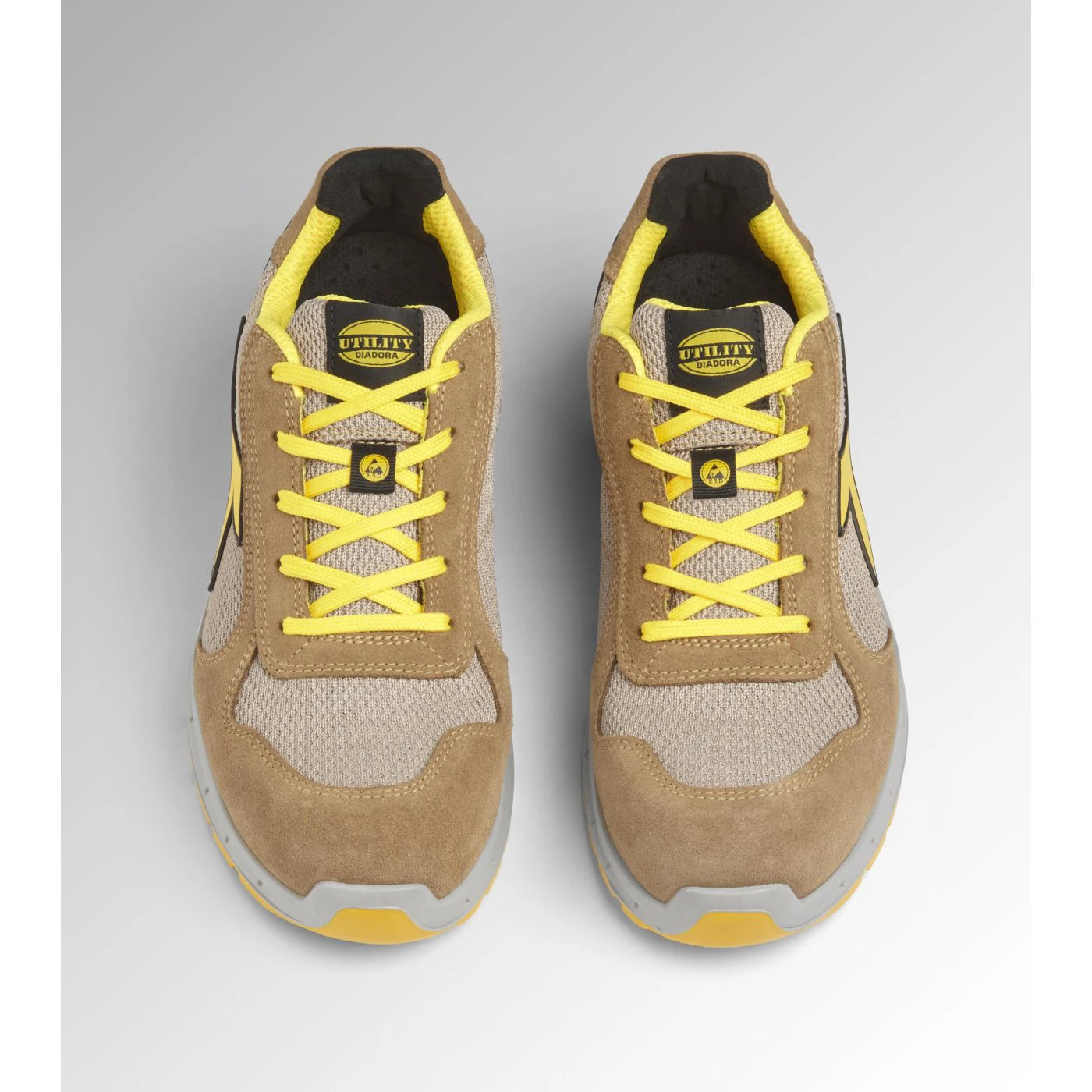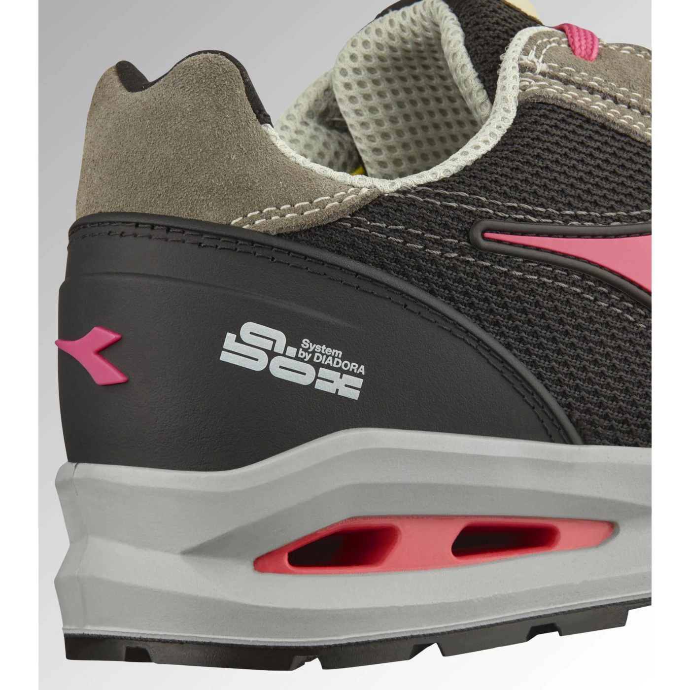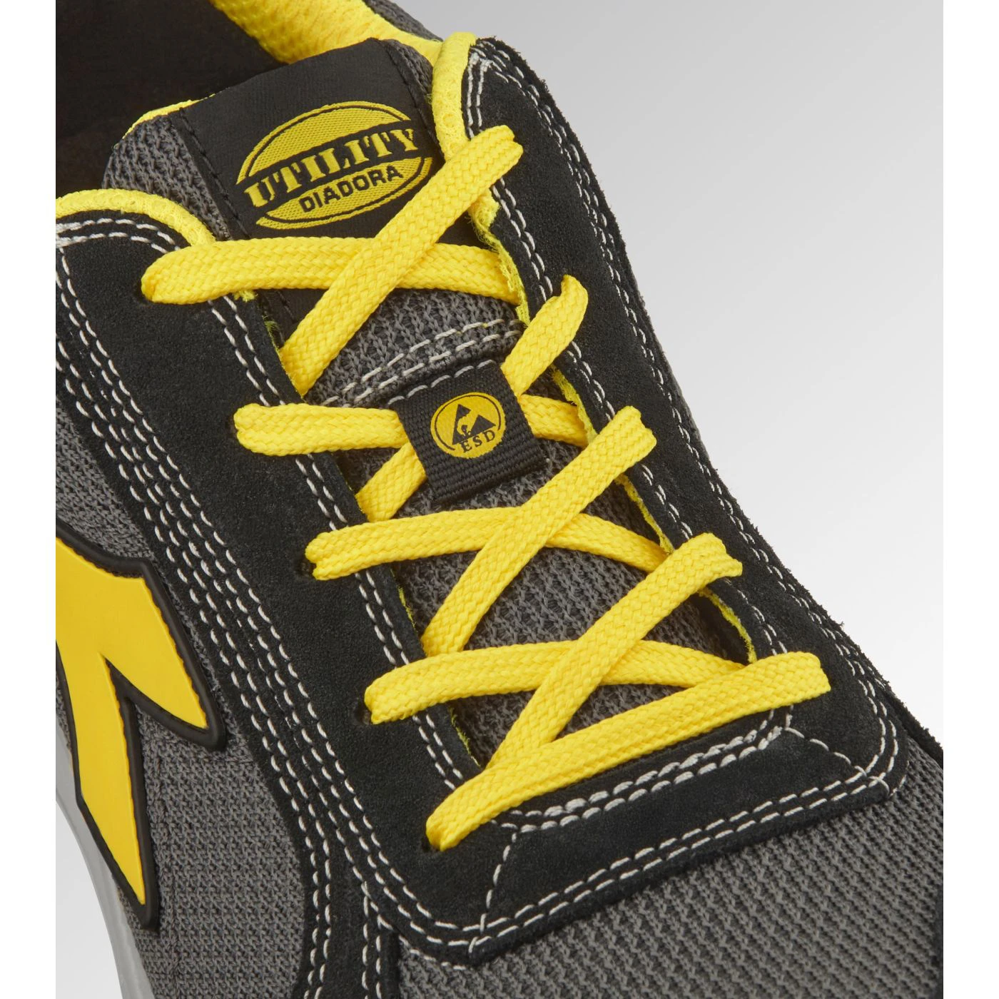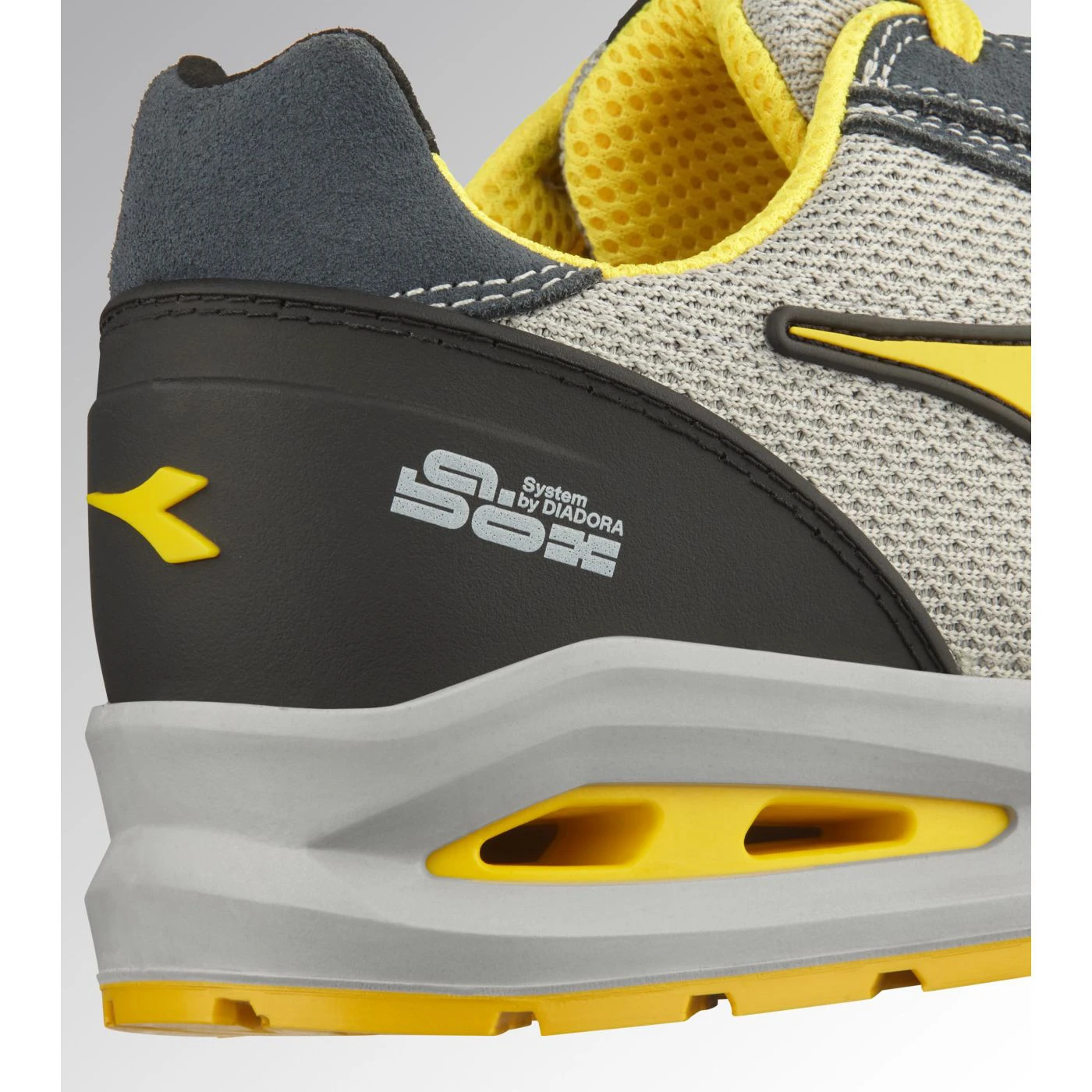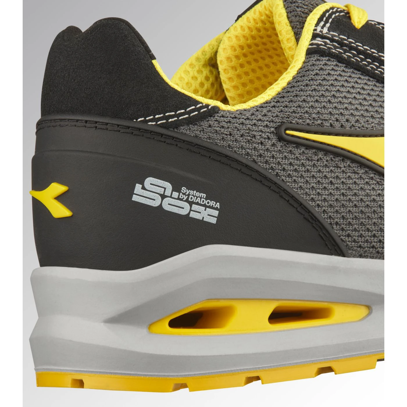 Low-top S1PS safety shoes in cowhide suede and 80% recycled, breathable polyester mesh. Ergonomic TPU heel support. 200J aluminium toe cap. K SOLE Ultralite anti-puncture insert. Width 11. A.Box System technology by Diadora with side breathability and Ariatex membrane. Air Mesh lining with 65% recycled polyester and a non-slip microfibre insert. Removable micro-perforated anatomical insole in open-cell PU foam with activated carbon. ESD.