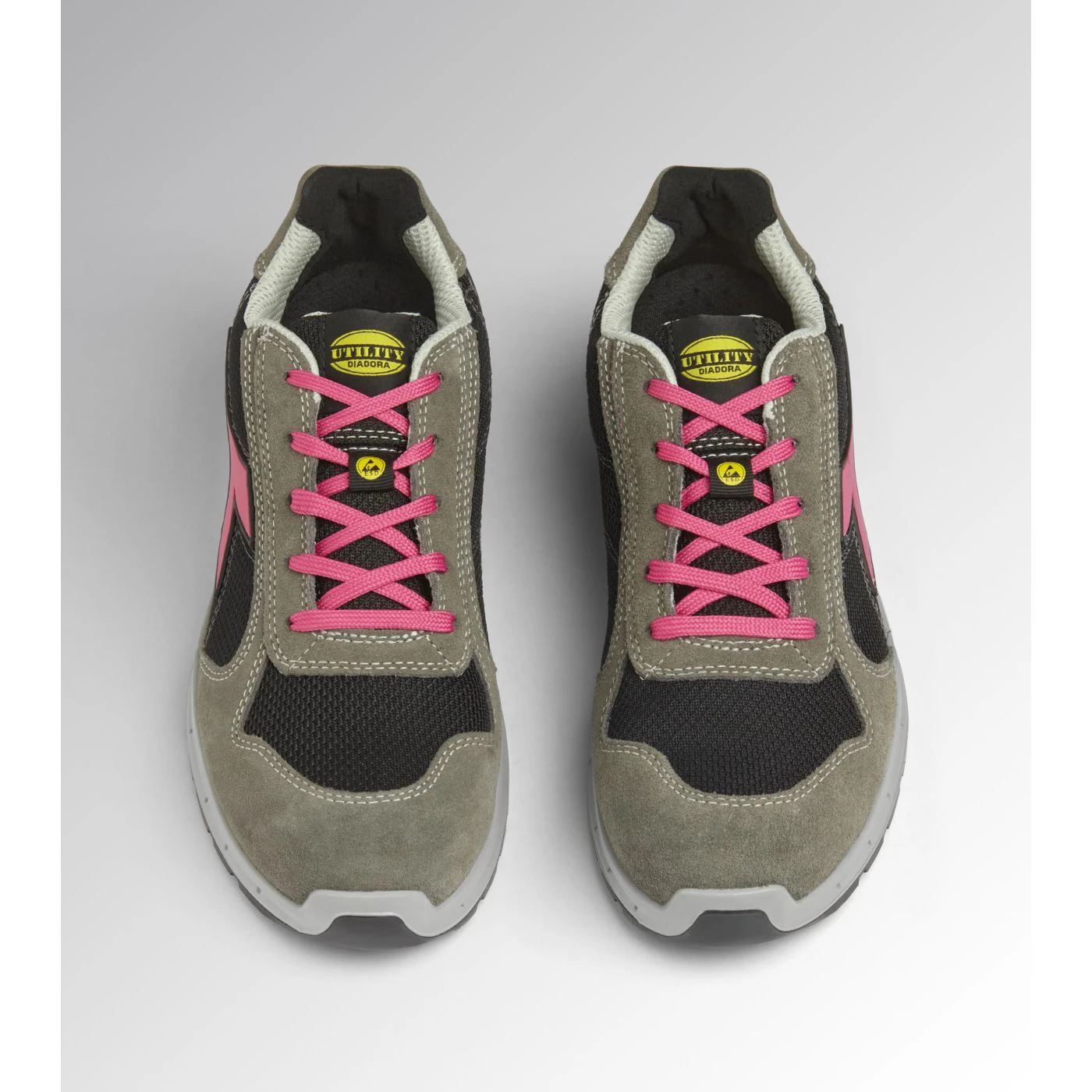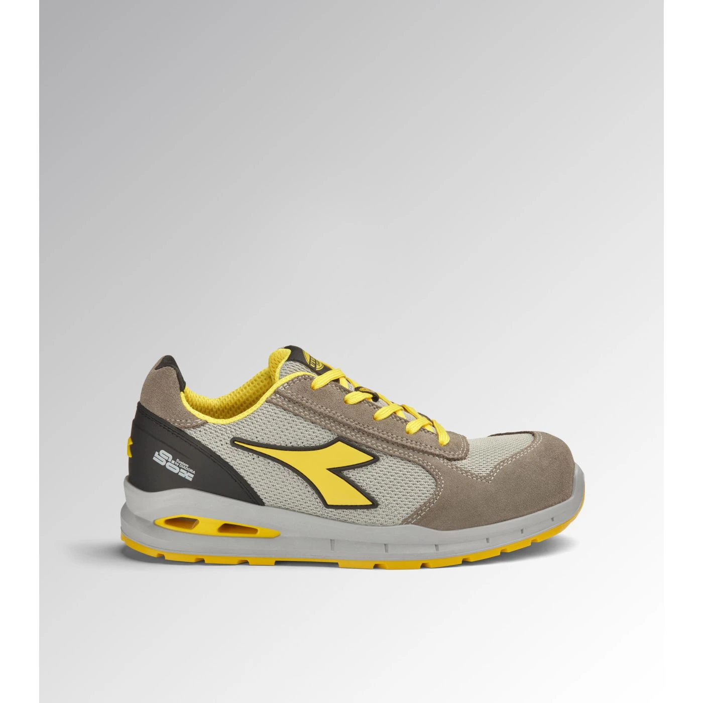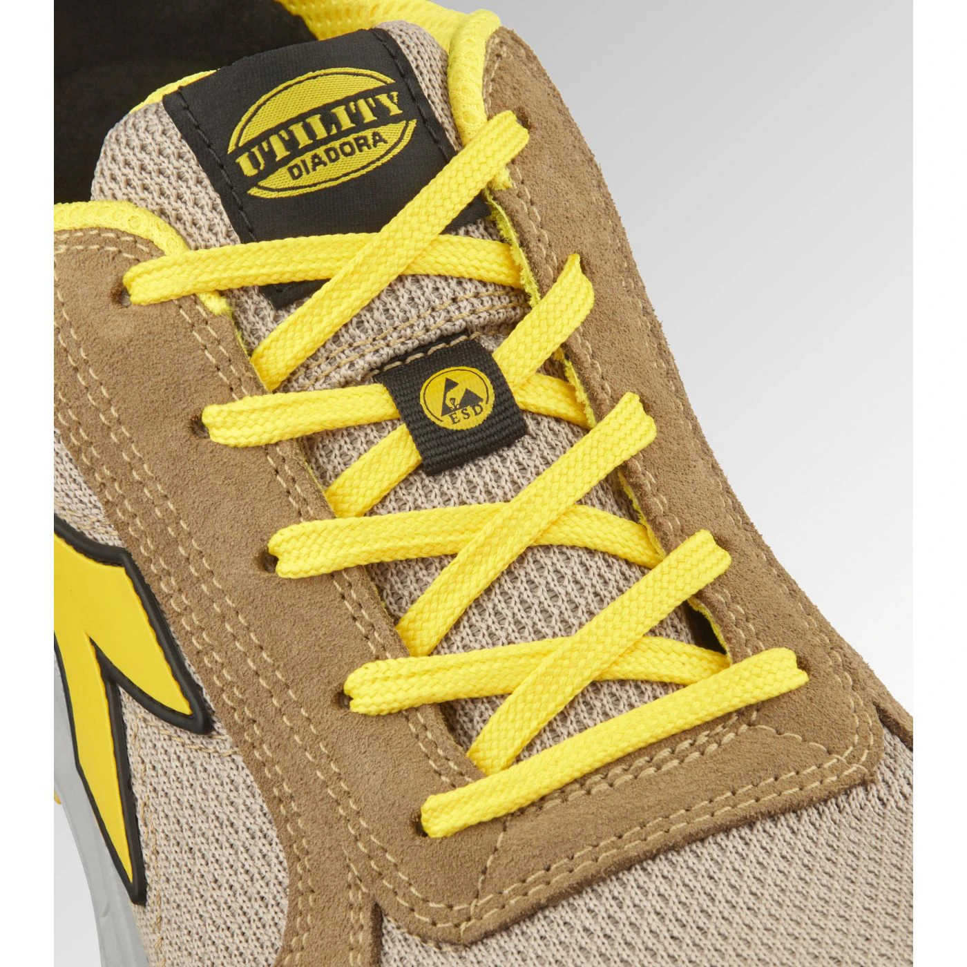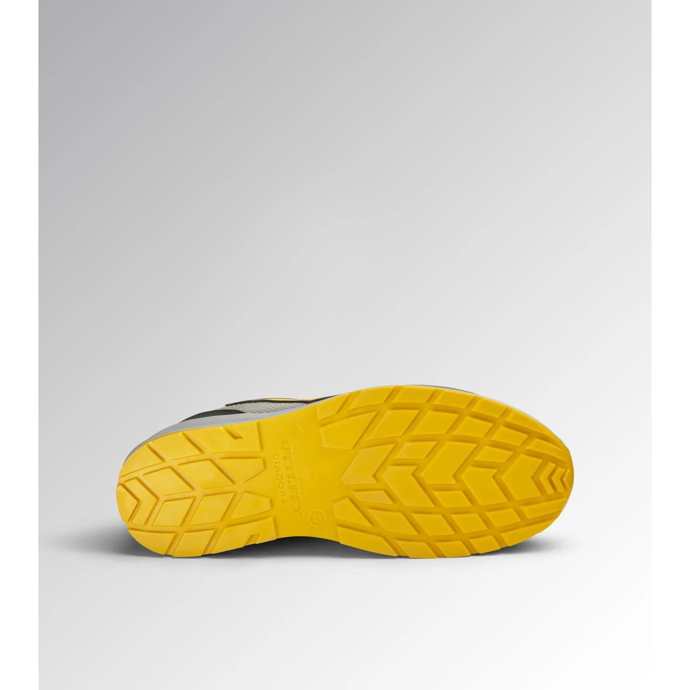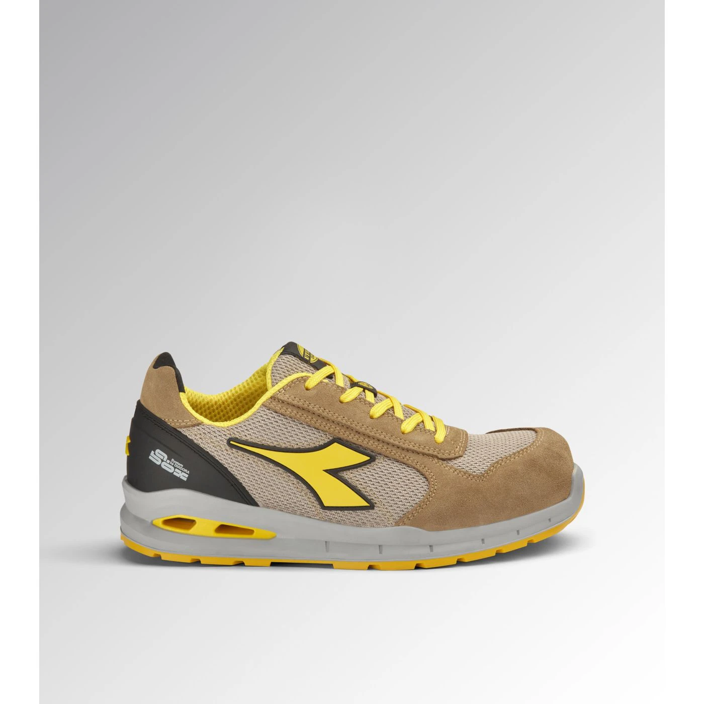 Low-top S1PS safety shoes in cowhide suede and 80% recycled, breathable polyester mesh. Ergonomic TPU heel support. 200J aluminium toe cap. K SOLE Ultralite anti-puncture insert. Width 11. A.Box System technology by Diadora with side breathability and Ariatex membrane. Air Mesh lining with 65% recycled polyester and a non-slip microfibre insert. Removable micro-perforated anatomical insole in open-cell PU foam with activated carbon. ESD.