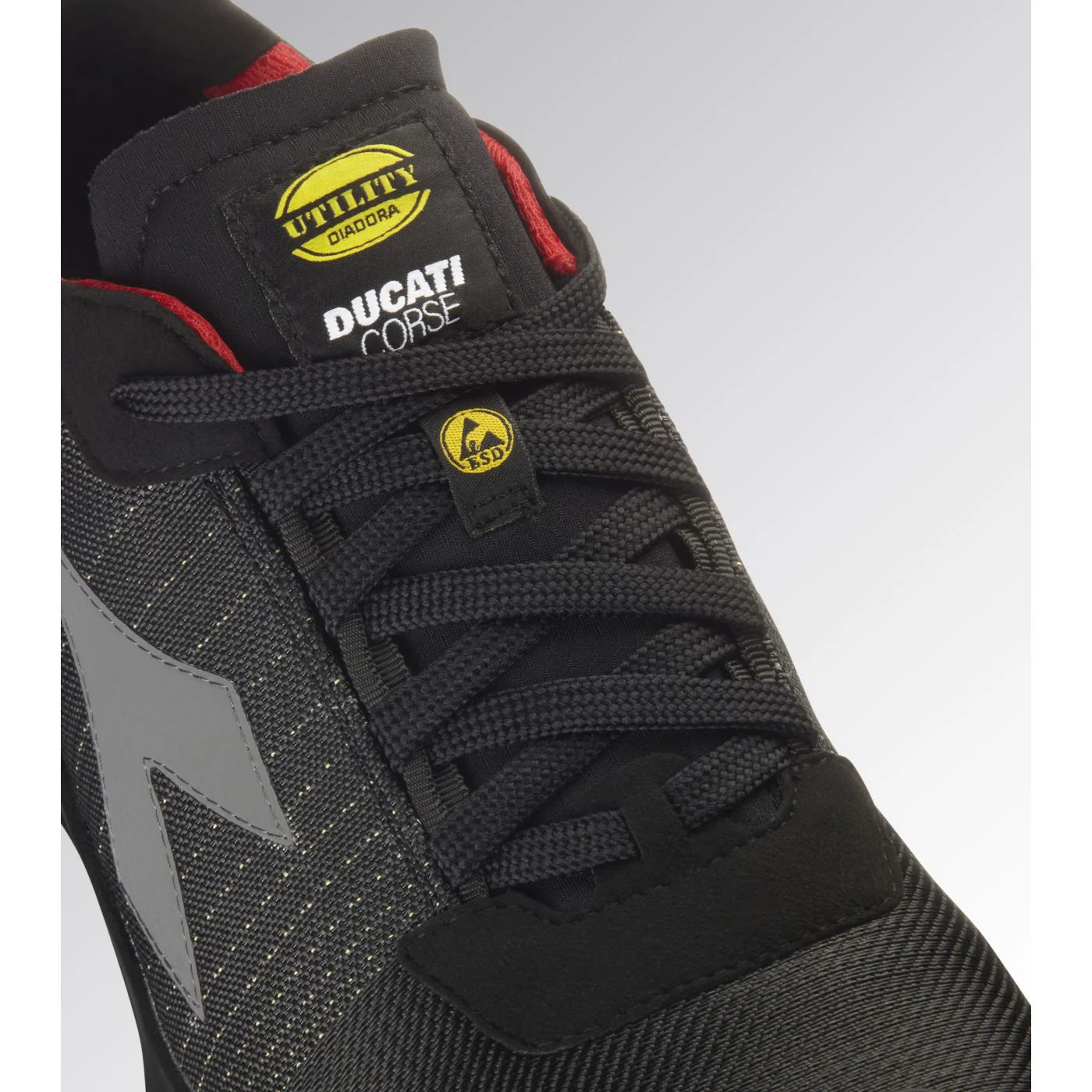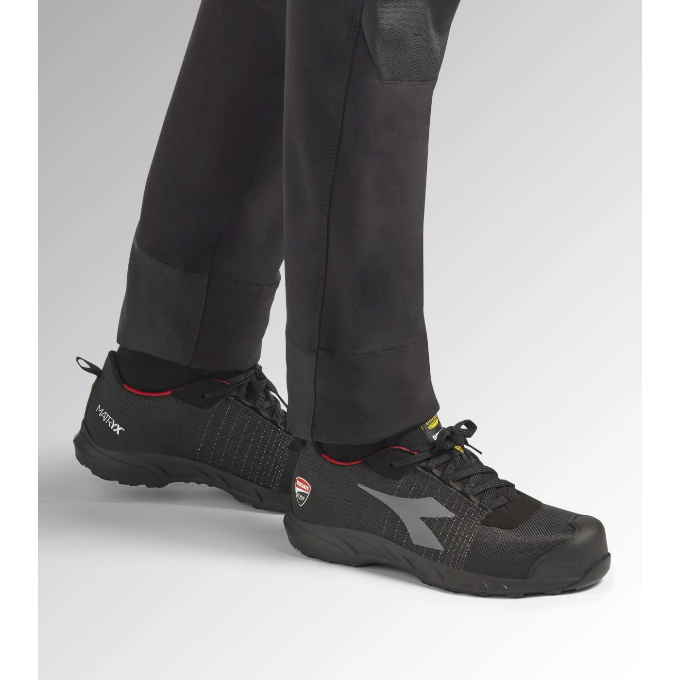 Calzatura di sicurezza bassa S3L idrorepellente in Matryx, tessuto tecnico multifibra traspirante e resistente all'abrasione. Personalizzazione DUCATI CORSE. Protezione della punta in TPU. Puntale in fibra di carbonio 200J. Inserto antiperforazione K SOLE ECO ultraleggero. Calzata 11. Vibram Litebase Technology. Fodera Air Mesh con antiscalzante in microfibra. Plantare anatomico, antistatico estraibile in PU espanso riciclato a celle aperte, traspirante con carboni attivi. ESD. Metal free.
