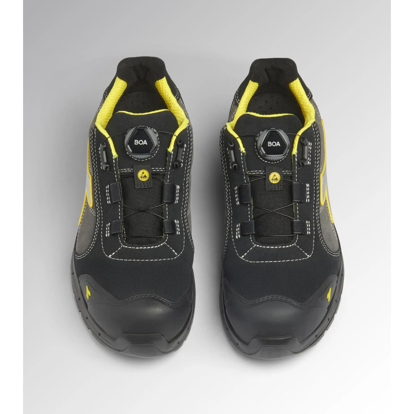 Low-top S3S safety shoes in water-repellent and breathable cowhide suede. BOA® Fit System for a micro-adjustable, precise fit. TPU toe cap and ergonomic heel support. 200J aluminium toe cap. K SOLE Ultralite anti-puncture insert. Width 11. A.Box System technology by Diadora with side breathability and Ariatex membrane. Air Mesh lining with 65% recycled polyester and a non-slip microfibre insert. Removable micro-perforated insole in open-cell PU foam that is breathable thanks to activated carbon. ESD.