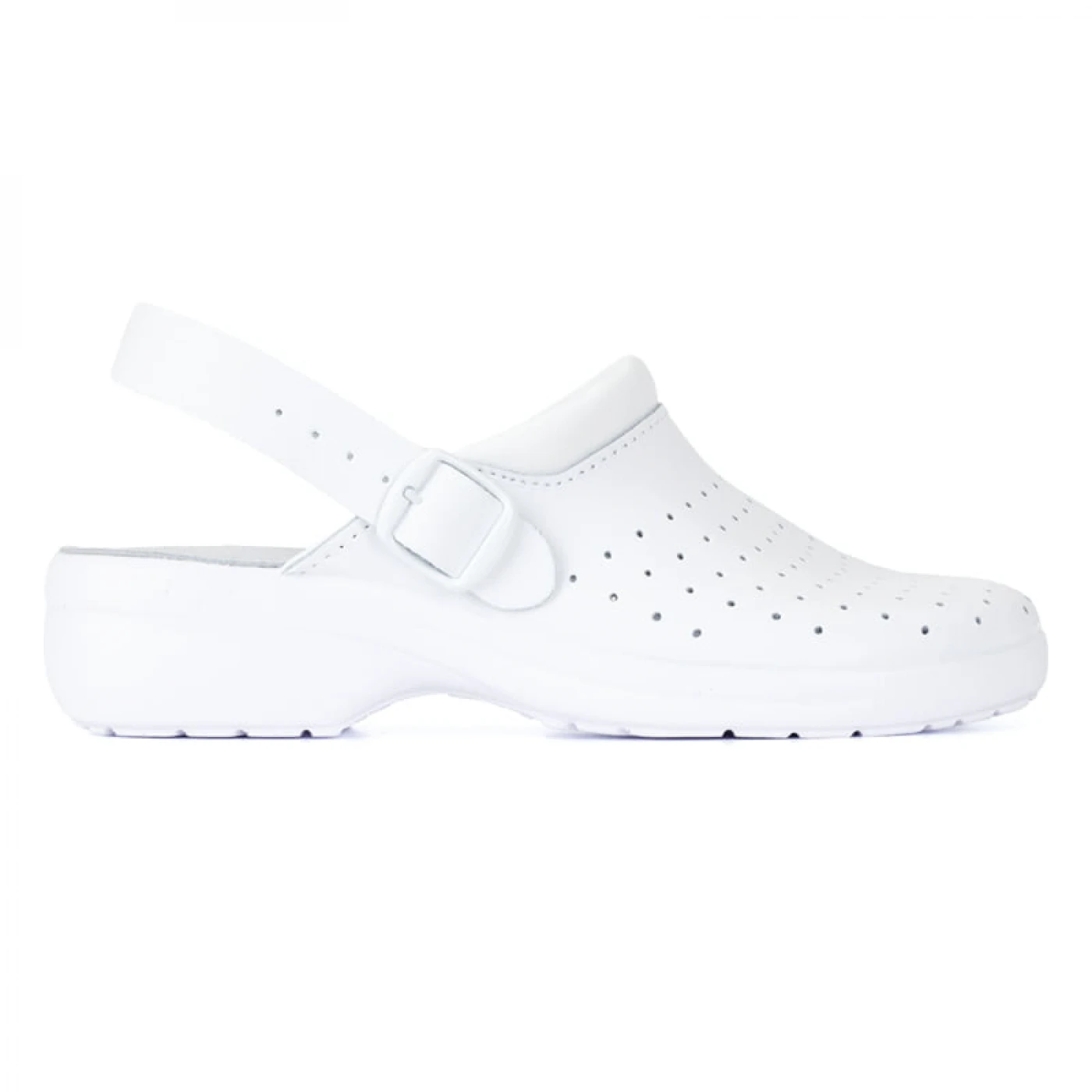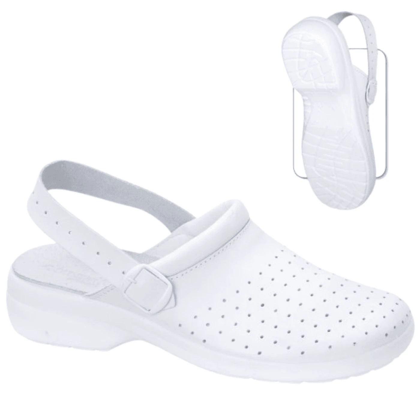 Saboti albi de lucru cu bareta, din piele neteda de bovina. Captuseala este din piele spalt de bovina prevazuta cu perforatii pentru aerisirea piciorului. Talpa este injectata, din poliuretan. Foarte usori si confortabili.