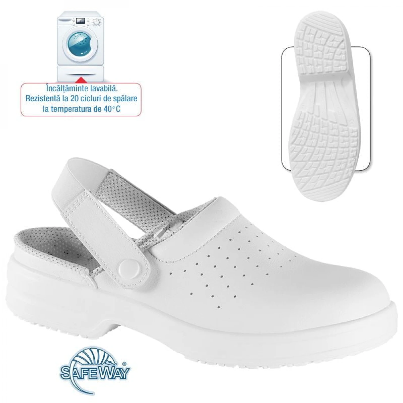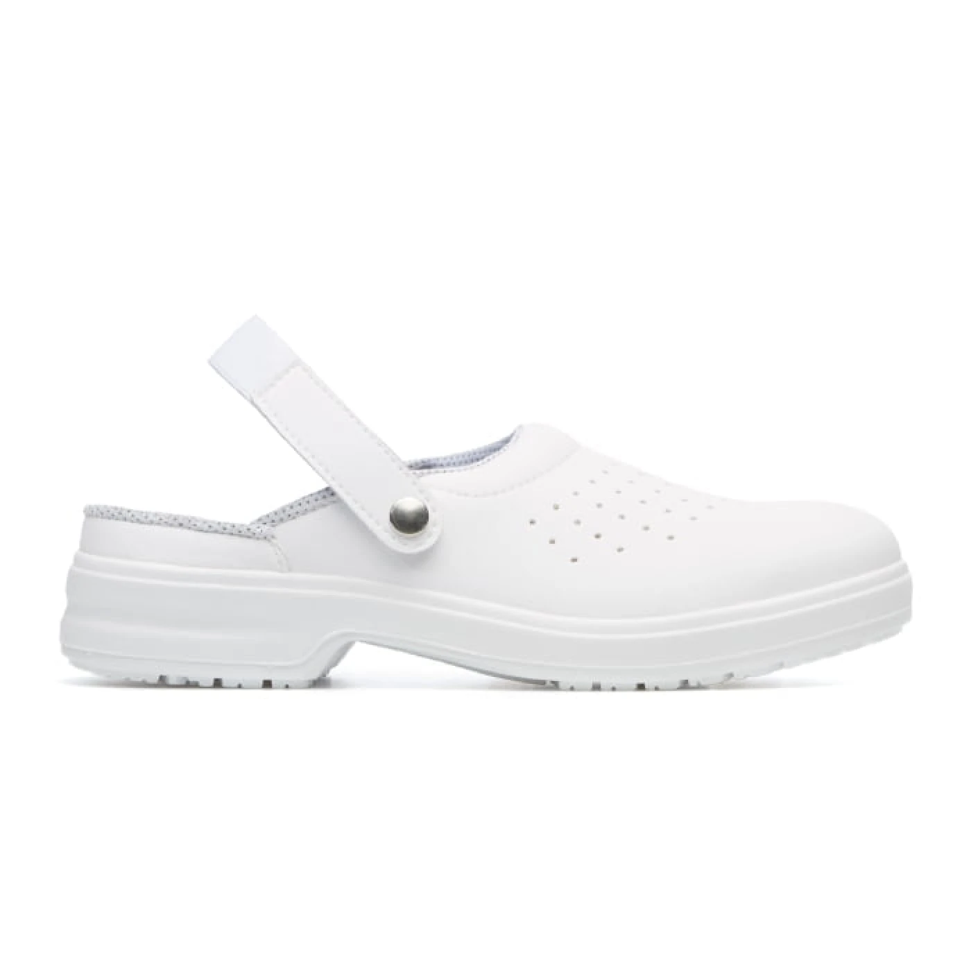 Saboti albi de protectie SB E A FO SRC din microfibra respirabila cu perforatii, cu bombeu metalic din otel rezistent la soc 200J si compresiune. Partea interioara este din material textil rezistent la abraziune si tratat antibacterial. Foarte confortabili datorita brantului Air-dry care asigura aerisirea piciorului. Talpa este injectata din poliuretan monodensitate