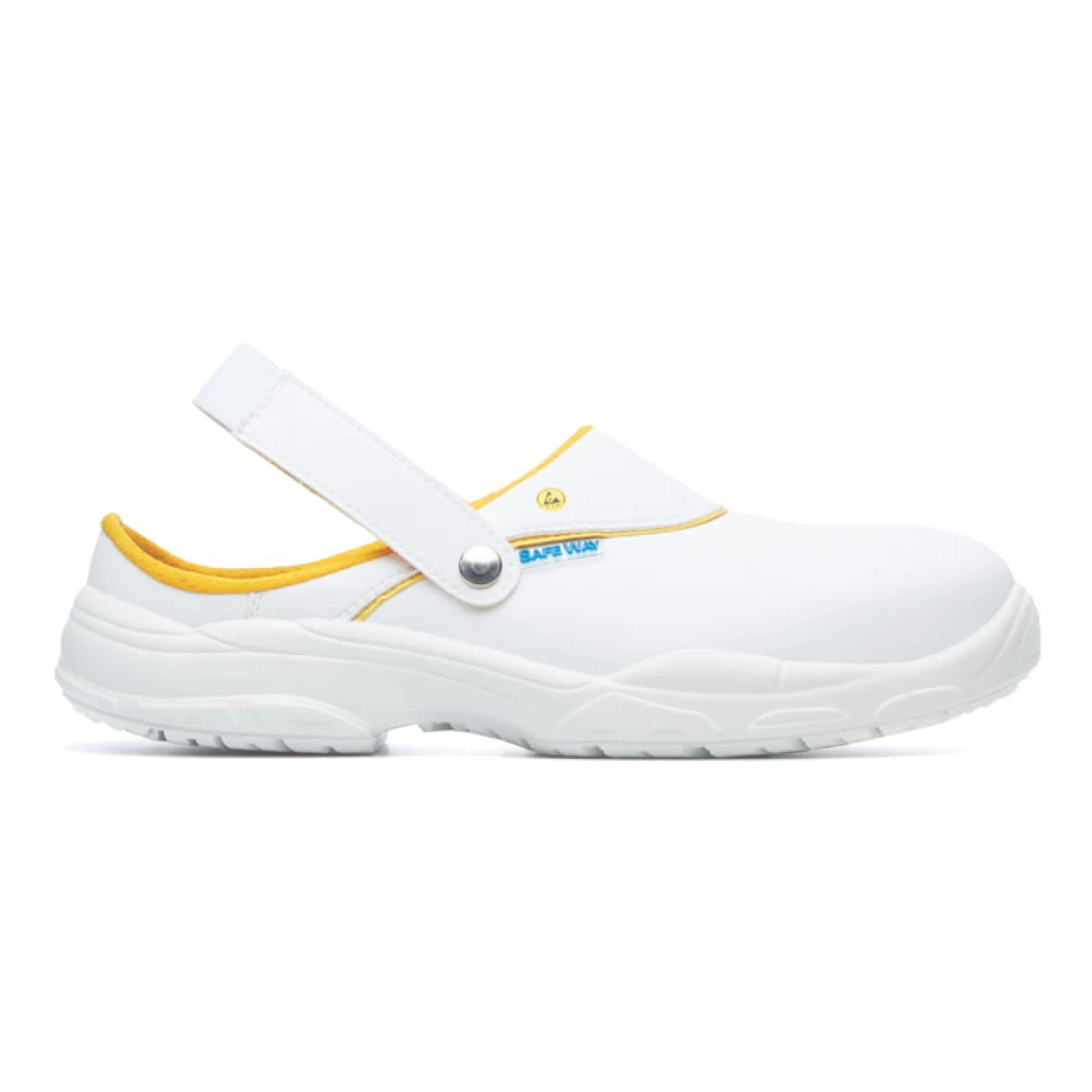 Saboti albi de protectie SB E A ESD SRC din microfibra respirabila, cu bombeu nemetalic din policarbonat. Asigura un comfort ridicat datorita brantului X-dry care are formă \nanatomică ‘antişoc’ cu suport din PE cu reţea de găuri si al captuselii din material textil perforat care permite aerisirea piciorului. Talpa este injectata, din poliuretan monodensitate, cu proprietati antistatice si antiderapante. Datorita tratamentului special aplicat asigura protectie impotriva descarcarilor electrostatice, protejand astfel componentele sensibile ale sistemelor electronice.
