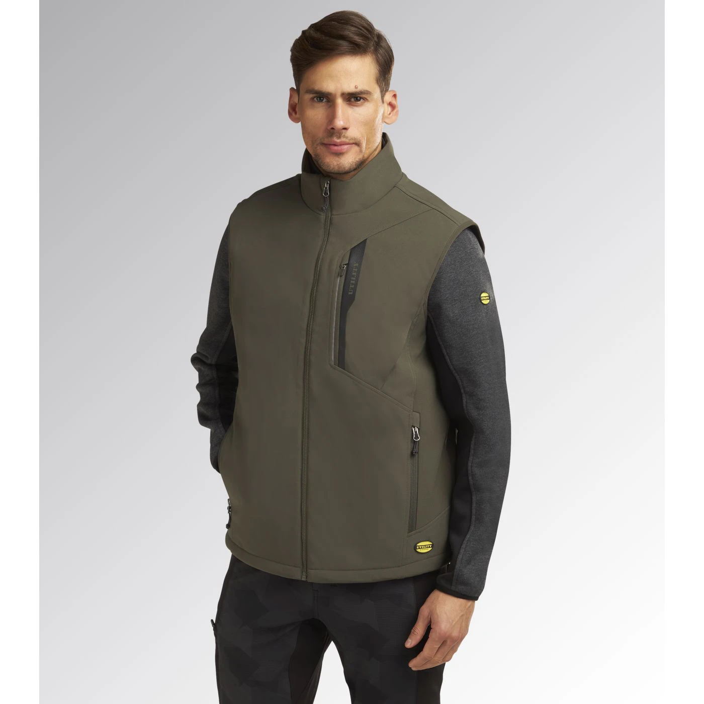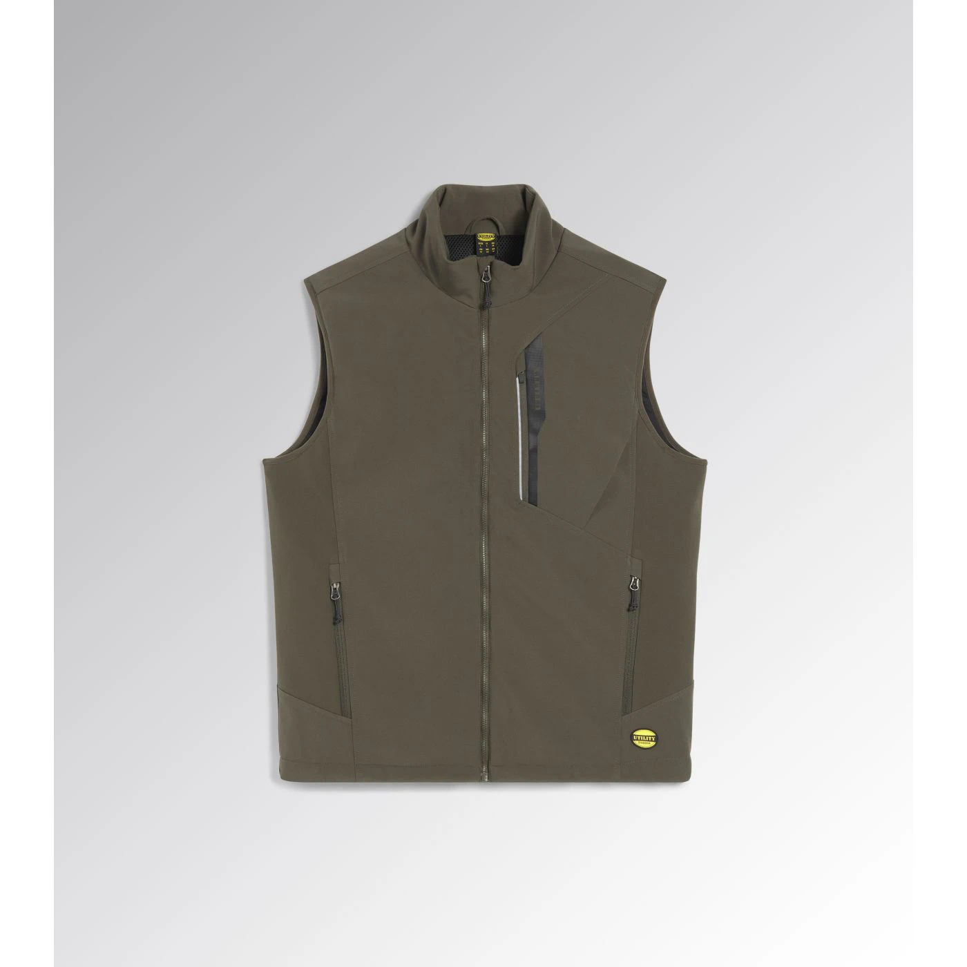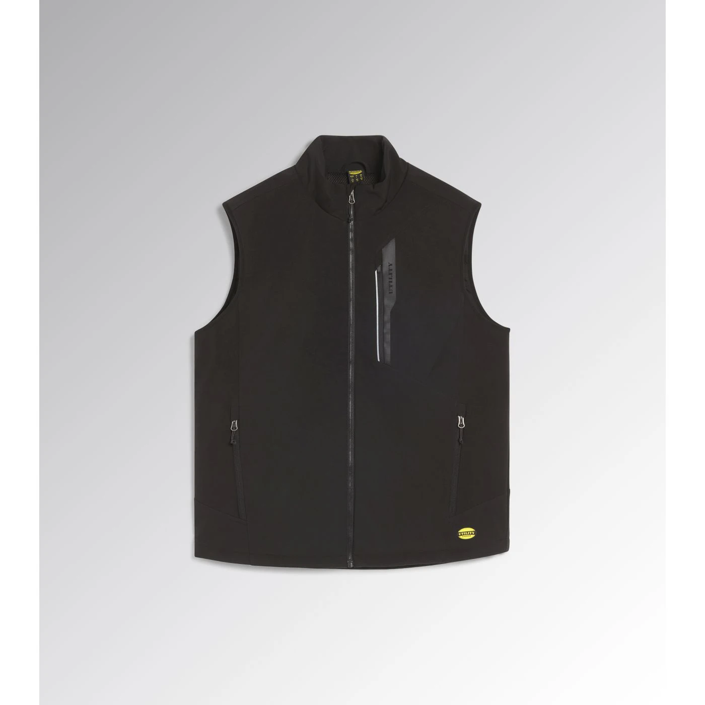 Windproof and water-repellent softshell vest with light padding. Stand-up collar with storm flap. Adjustable hem with drawstring and a longer back for a better fit. Two side pockets and one front pocket with zip and a heat-sealed Utility-branded print. Reflective details for better visibility. Inner 3D mesh inserts with opening on rear yoke for better breathability.