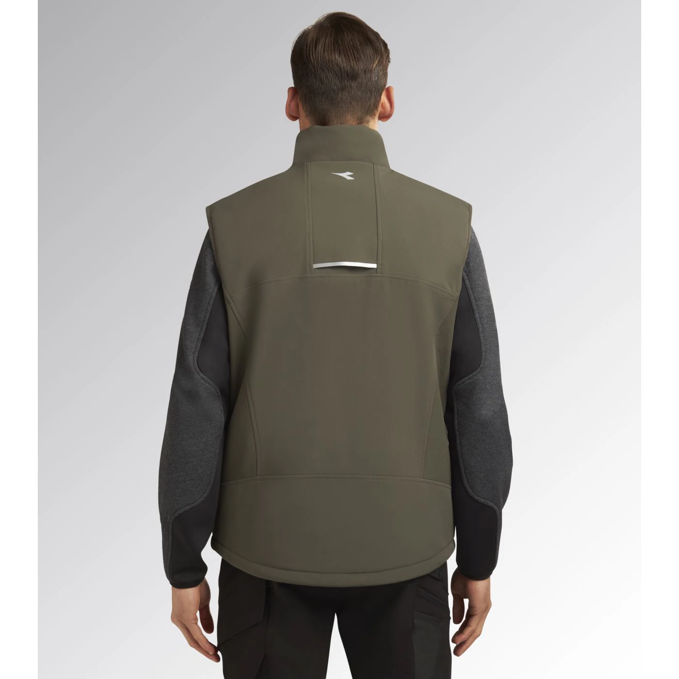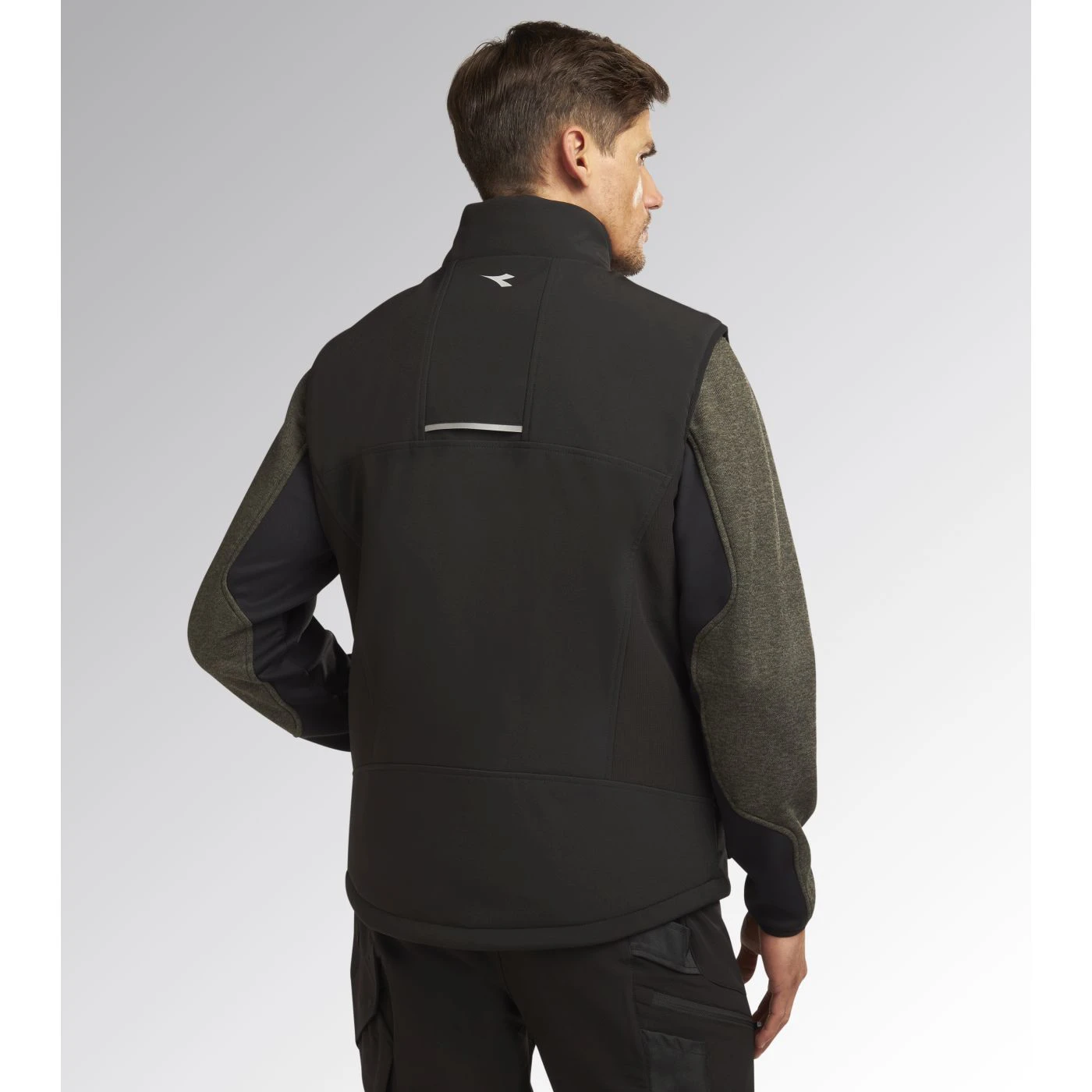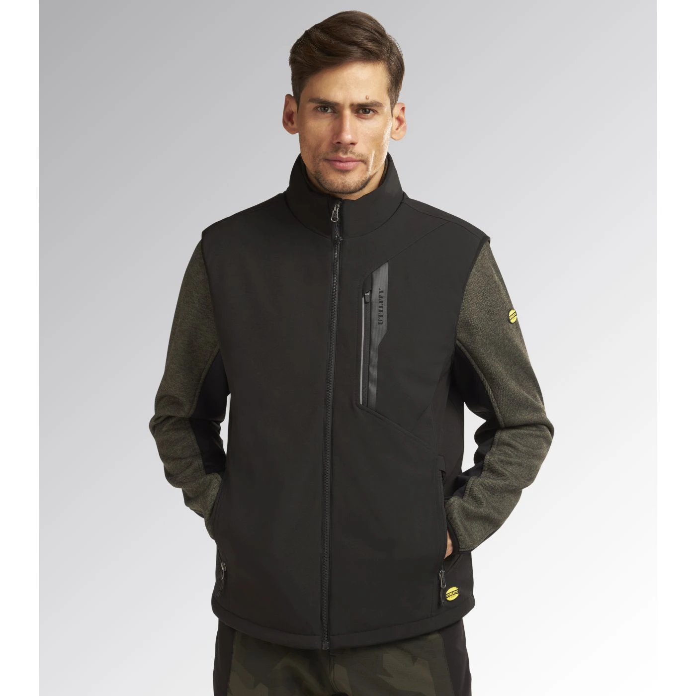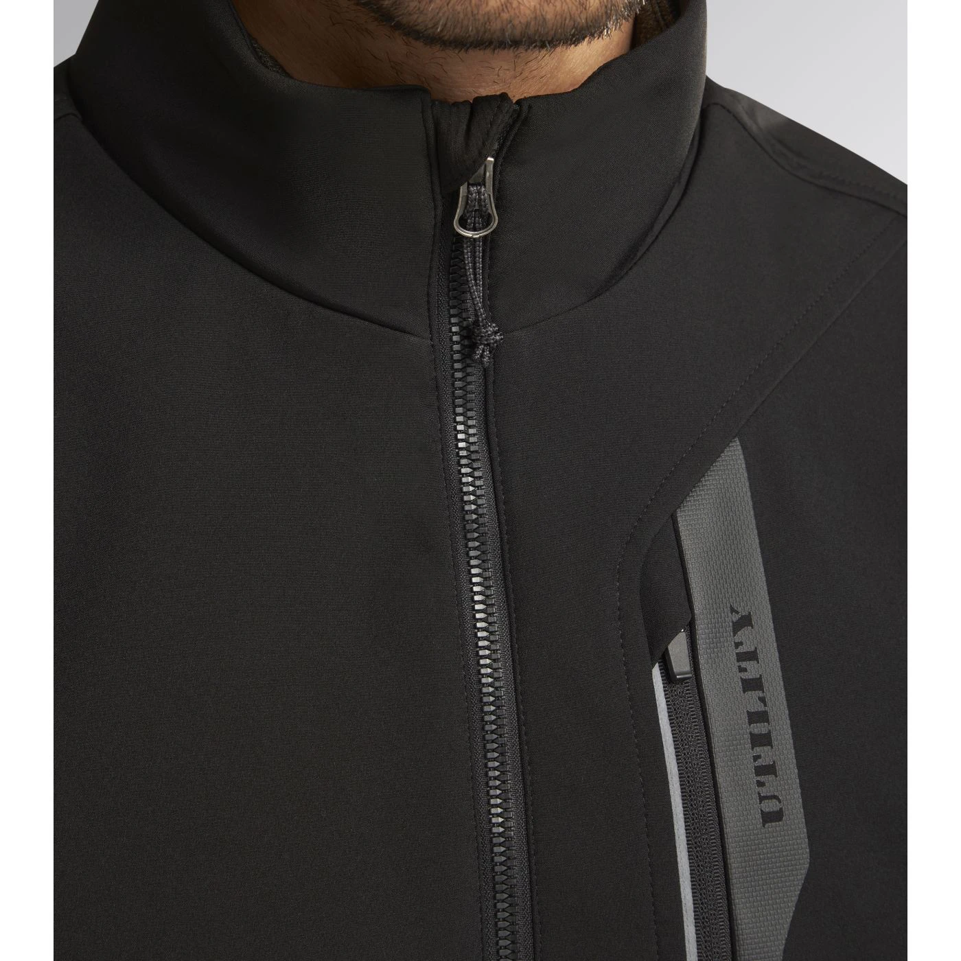 Windproof and water-repellent softshell vest with light padding. Stand-up collar with storm flap. Adjustable hem with drawstring and a longer back for a better fit. Two side pockets and one front pocket with zip and a heat-sealed Utility-branded print. Reflective details for better visibility. Inner 3D mesh inserts with opening on rear yoke for better breathability.