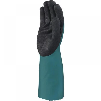 Dublă membrană de nitril pe suport de poliamidă. Al treilea membrană din spumă de nitril cu structură aspră pe palmă și vârfurile degetelor. Lungime: 35 cm. Grosime: 1,15 mm pe manșetă - 1,30 mm pe palma.