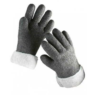 Mănuşi cusute-tricot interlock din bumbac, imersate în PVC, suprafaţa înăsprită cu o tehnologie specială, căptuşeală din blană sintetică detaşabilă, lungime totală 27 cm.