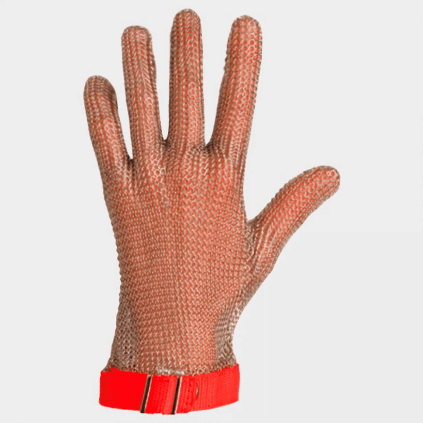 Mănuși din inele din oțel inoxidabil, manșetă textilă cu cataramă metalică pentru prindere.